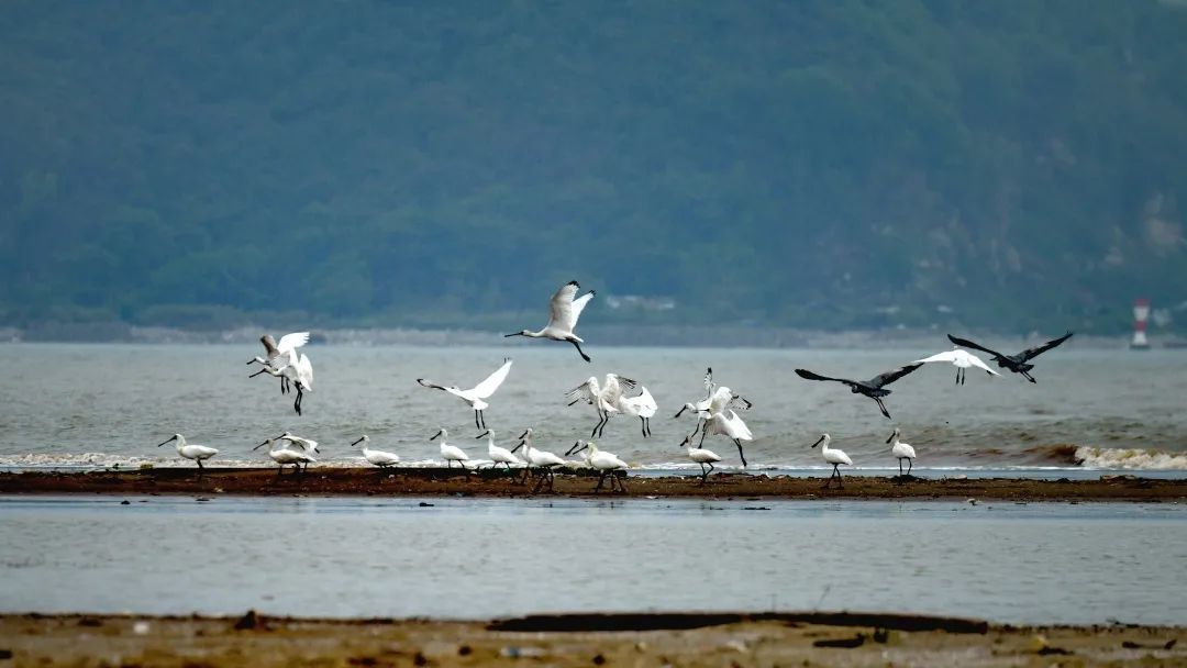 在三灶镇沙沥,一群黑脸琵鹭时而沿着浅滩休闲地寻找食物,时而展翅翱翔。