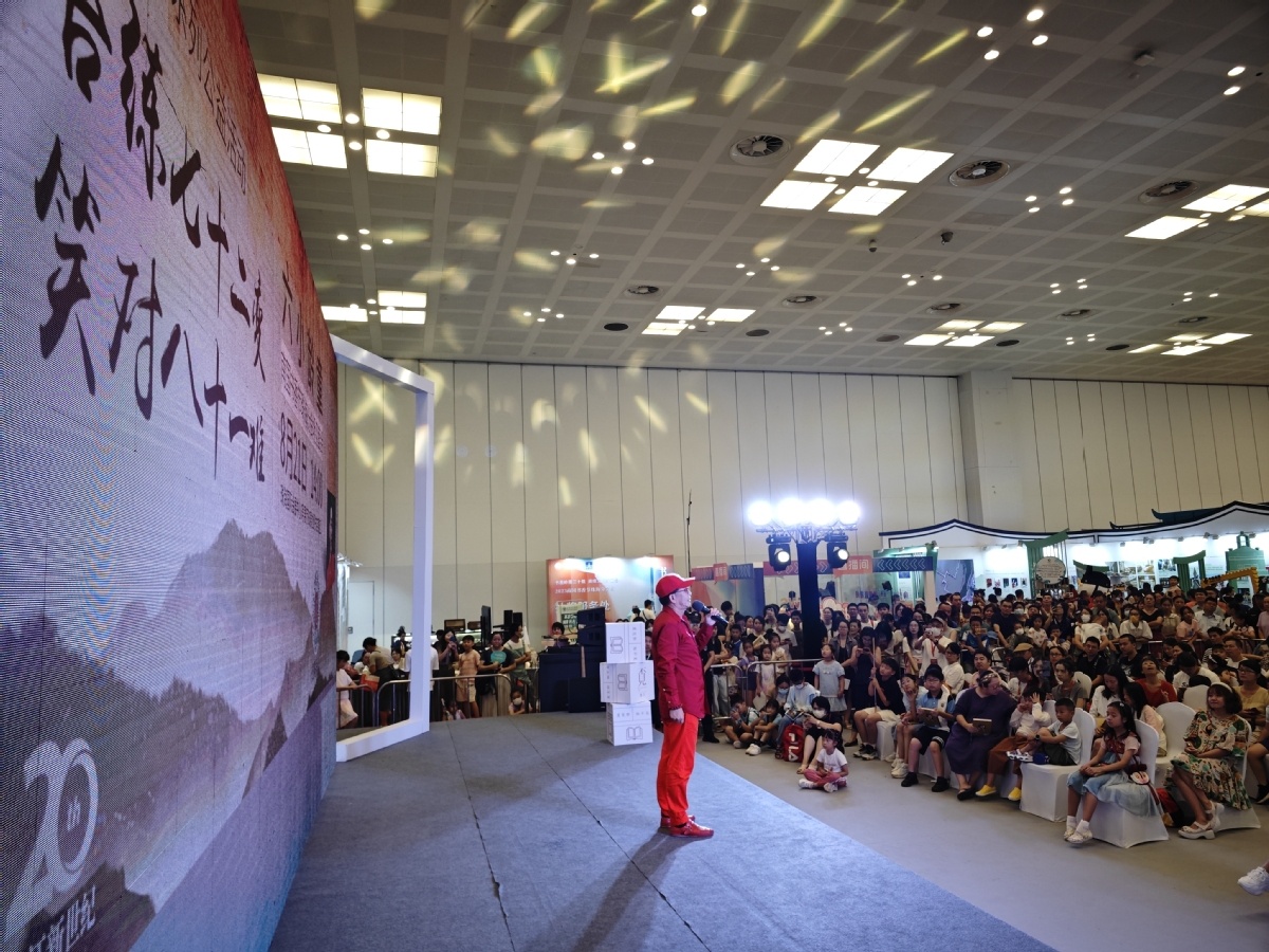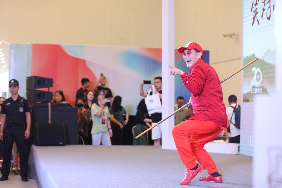 随后,六小龄童现场炫技,耍起手中的金箍棒,用手遮眼四处张望,尽显经典角色美猴王的神态。不少观众举起手机拍照留念,也有小朋友在台下模仿六小龄童的表演动作。