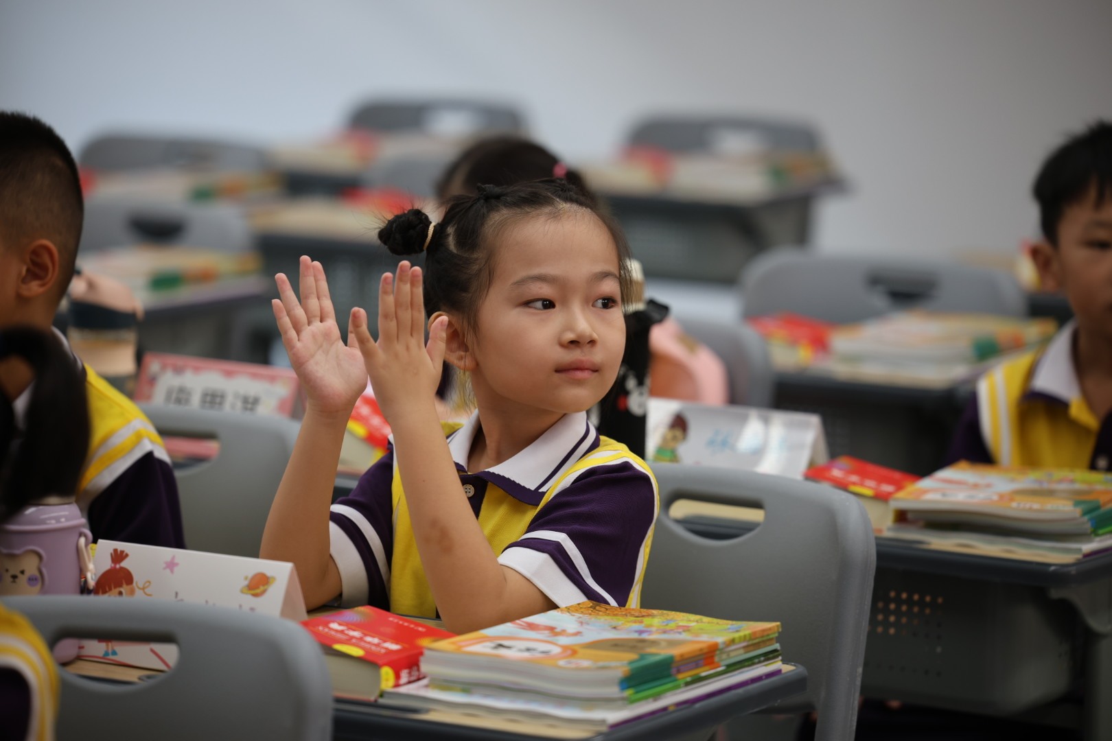 抢答问题,学生把手举得老高。 南方+ 关铭荣 拍摄