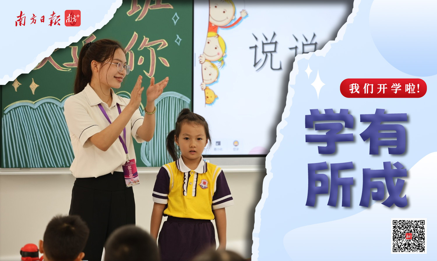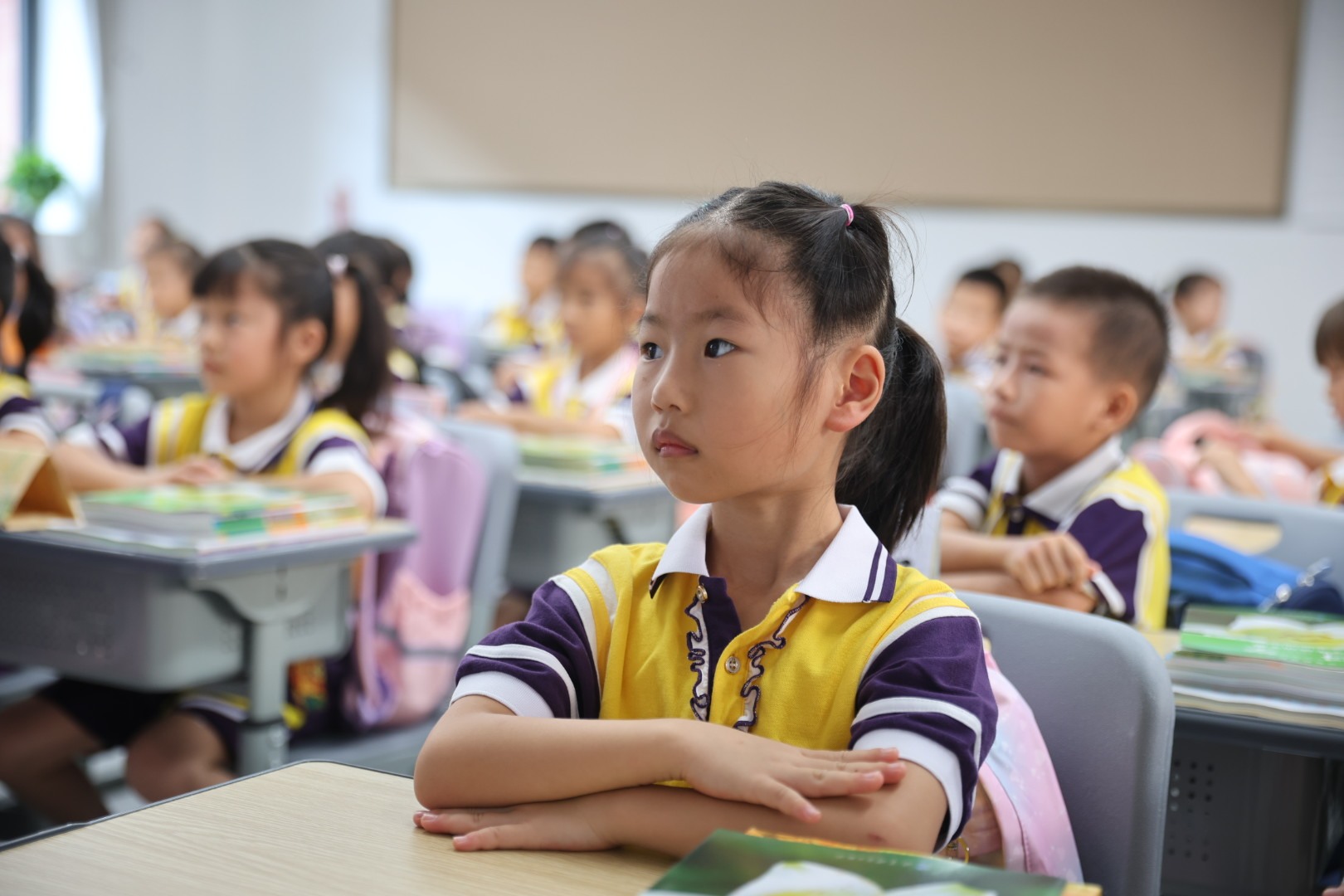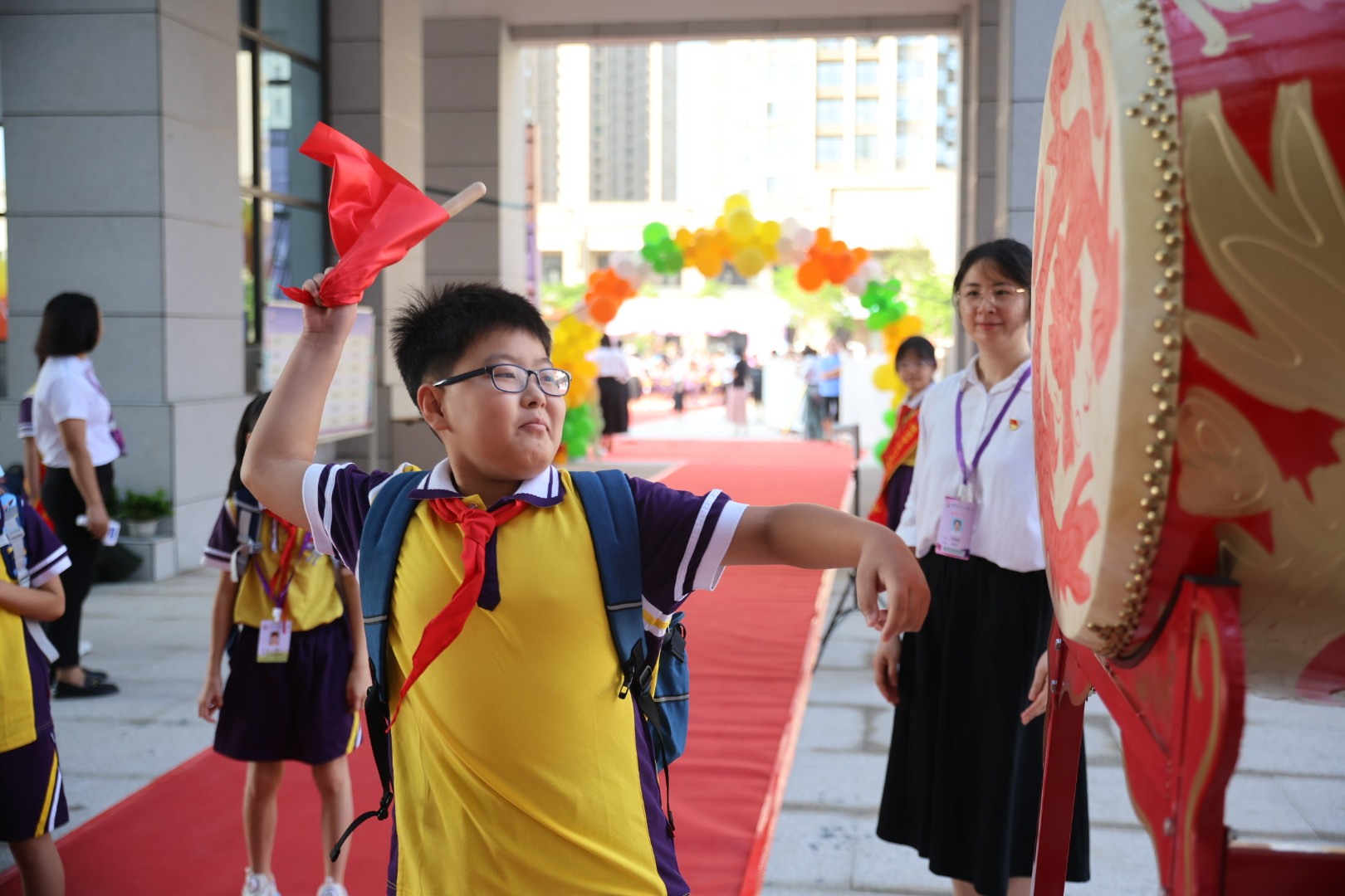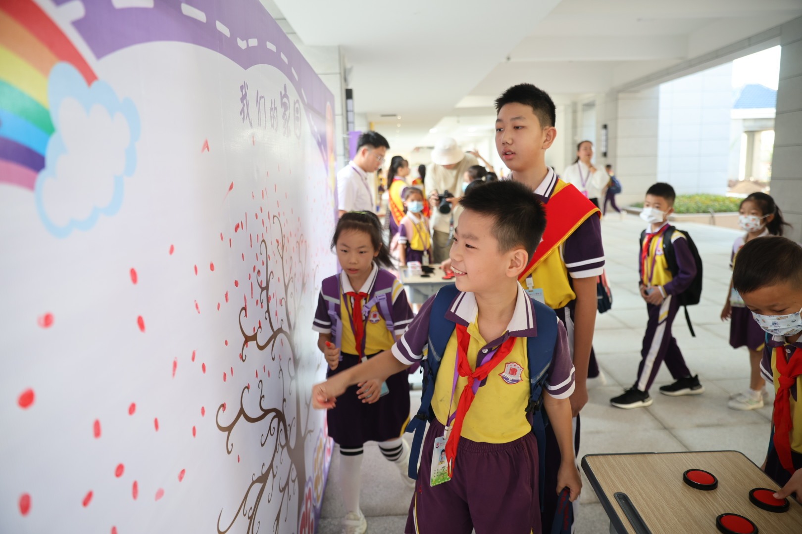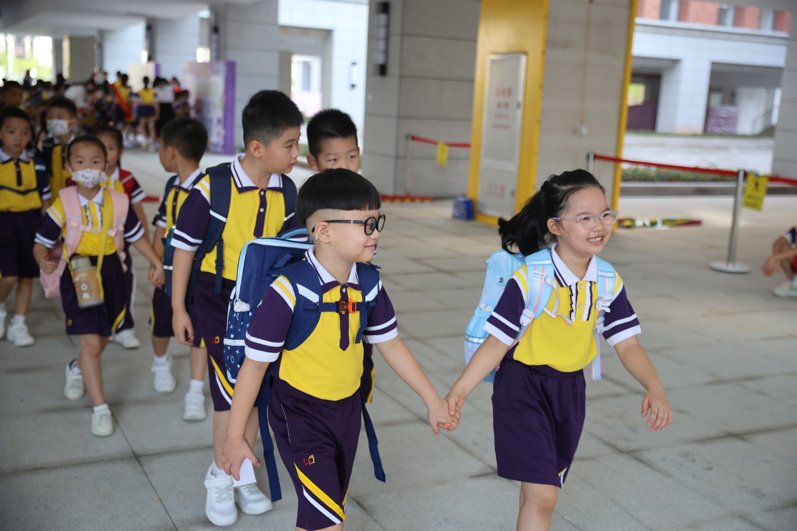 9月3日清晨,珠海市斗门区博雅小学的一年级新生开开心心走进校园,热情地与老师打招呼。