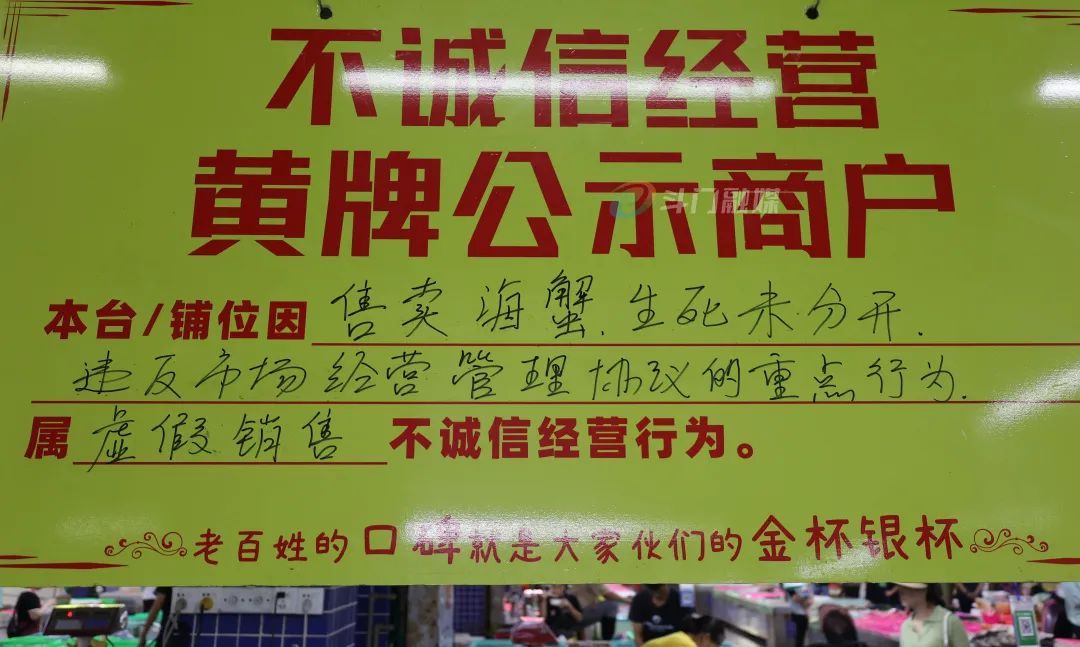 如此巨型的黄牌,被高高挂起,现场海鲜档主不但毫不抵触,反为日渐严格的管理制度集体点赞。