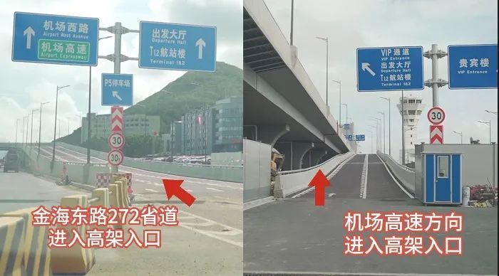 届时,前往珠海机场“T1航站楼出发层”的车辆,请依照交通指示标识,从金海东路或机场高速方向新建高架桥入口直接驶入。