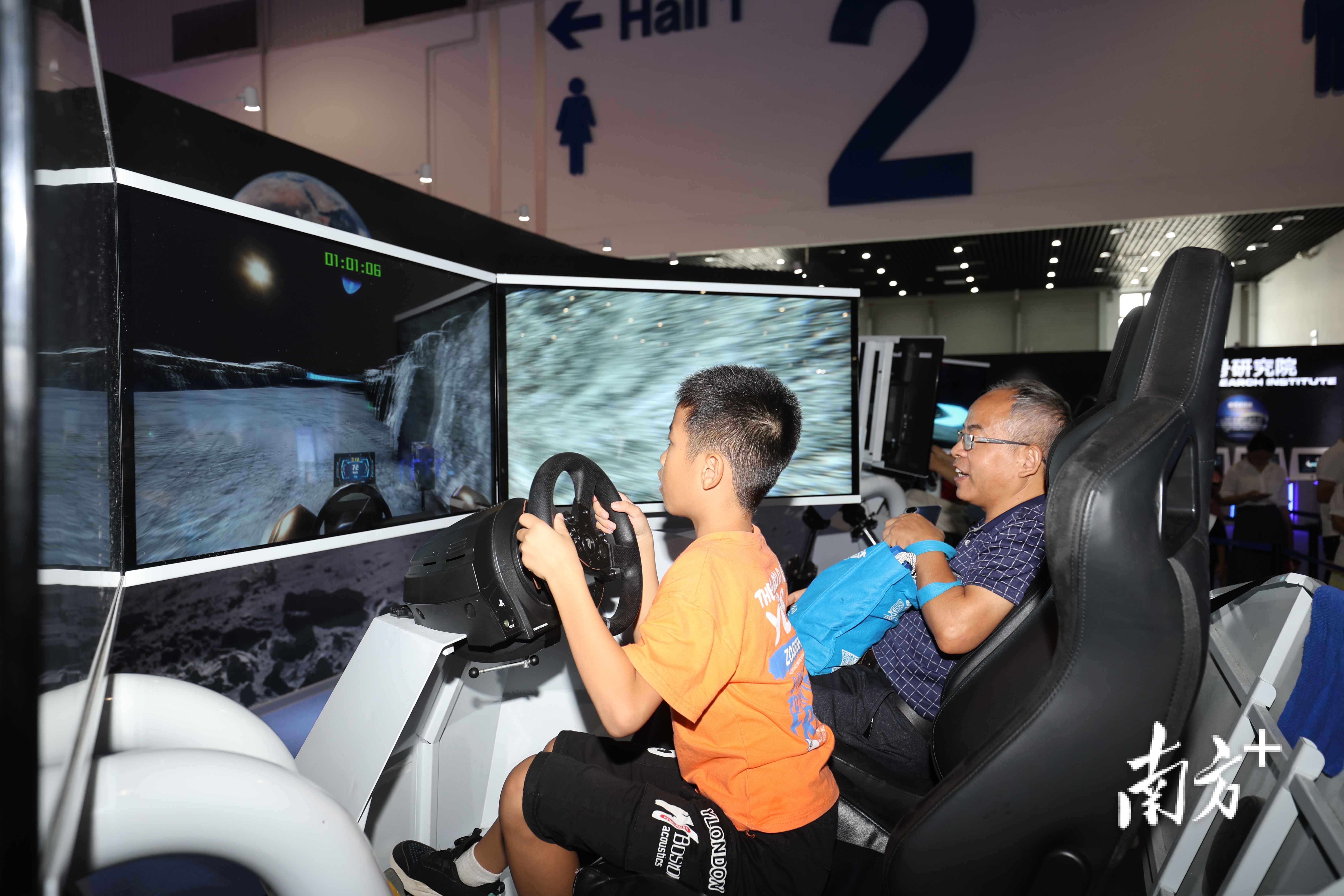 在航天展区,观众可展开“登月”“探火”之旅,通过“数字月球”来一场足不出户的“登月演练”;也可以进入“月球”开采矿场或育种实验室,完成各项神秘任务;更可坐上“月球车”“火星车”等各类太空交通工具,体验宇宙间穿梭。