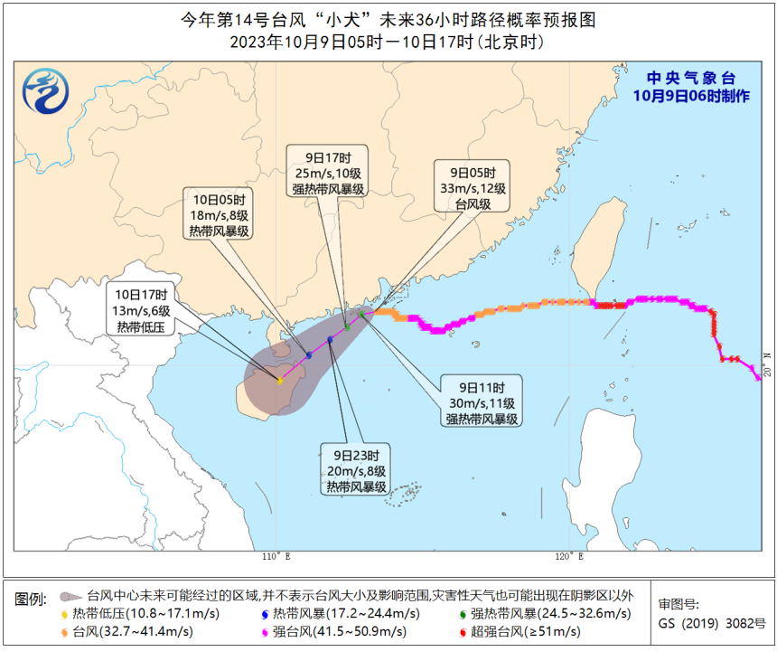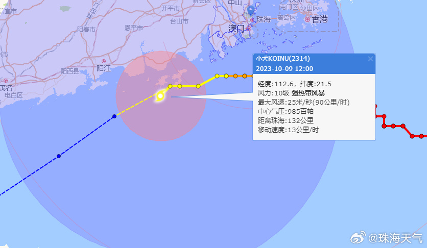 10月9日12时,台风“小犬”(强热带风暴级)位于珠海市西南方约130公里的海面上,中心附近最大风力10级(25米/秒)。预计“小犬”未来将向西南方向移动,逐渐趋向广东西部到海南东部一带沿海,强度减弱。目前台风蓝色预警信号正在生效,请继续做好各项防御工作。