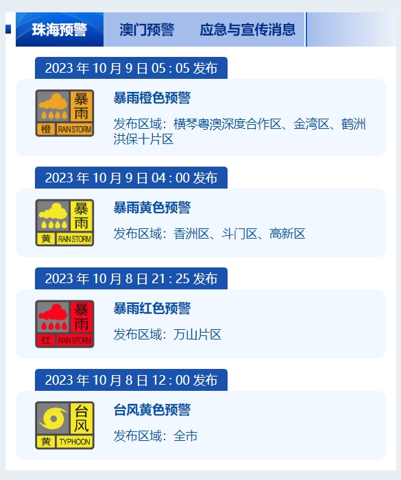珠海市气象台10月9日7时20分发布,预计珠海强降雨仍将持续,市气象台已将横琴粤澳深度合作区、金湾区、鹤洲洪保十片区暴雨预警信号升级为红色,香洲区、斗门区及高新区暴雨预警信号升级为橙色,万山片区暴雨红色预警信号和全市台风黄色预警信号继续生效。