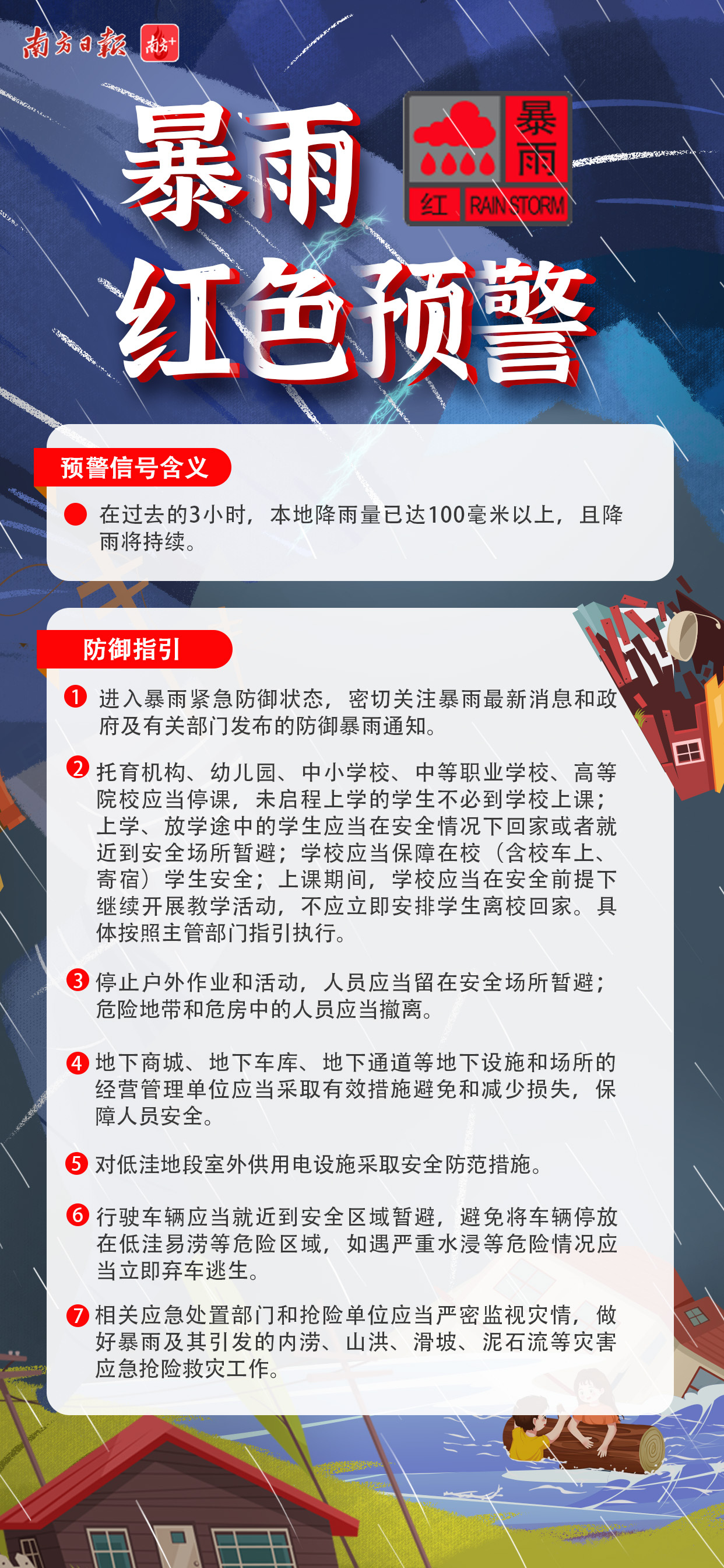 【珠海市暴雨红色预警信号现正生效】珠海市气象台于10月9日9时20分发布珠海市暴雨红色预警信号,请注意防御。暴雨红色预警信号生效区域内的托育机构、幼儿园、中小学校、中等职业学校、高等院校停课。(珠海市突发事件预警信息发布中心)