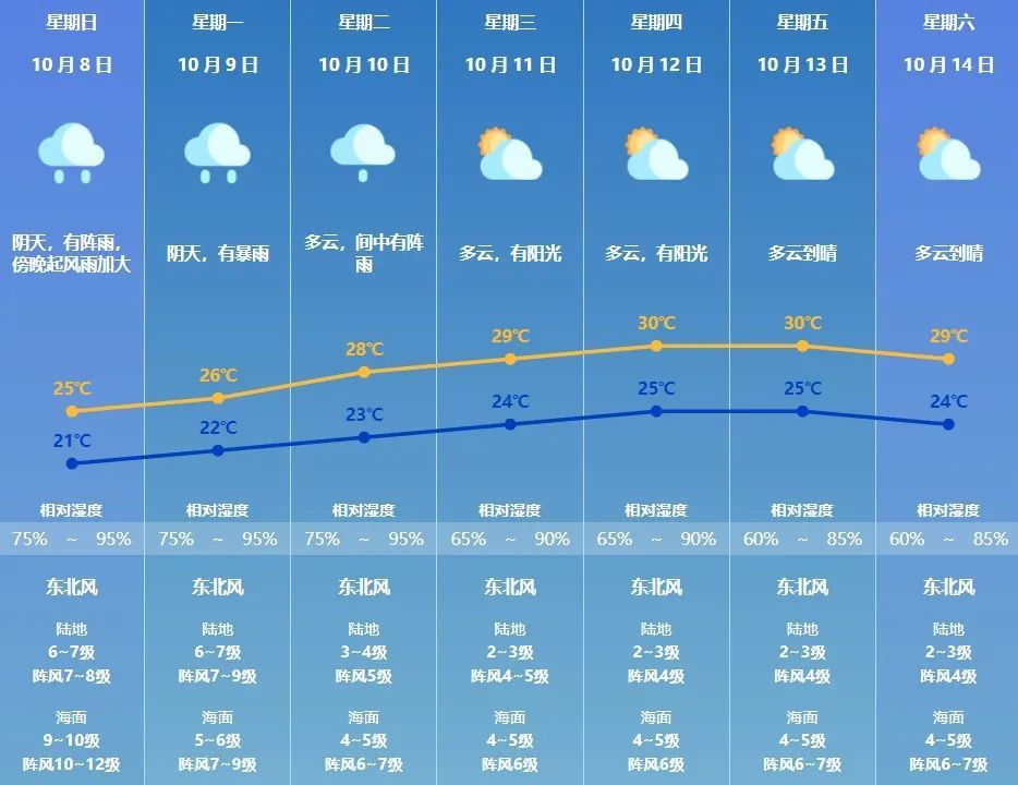 预计今晚到明天,珠海市阴天,有大雨,气温22到26℃,相对湿度75%到95%,吹清劲东北风。11日,多云,部分时间有阳光。