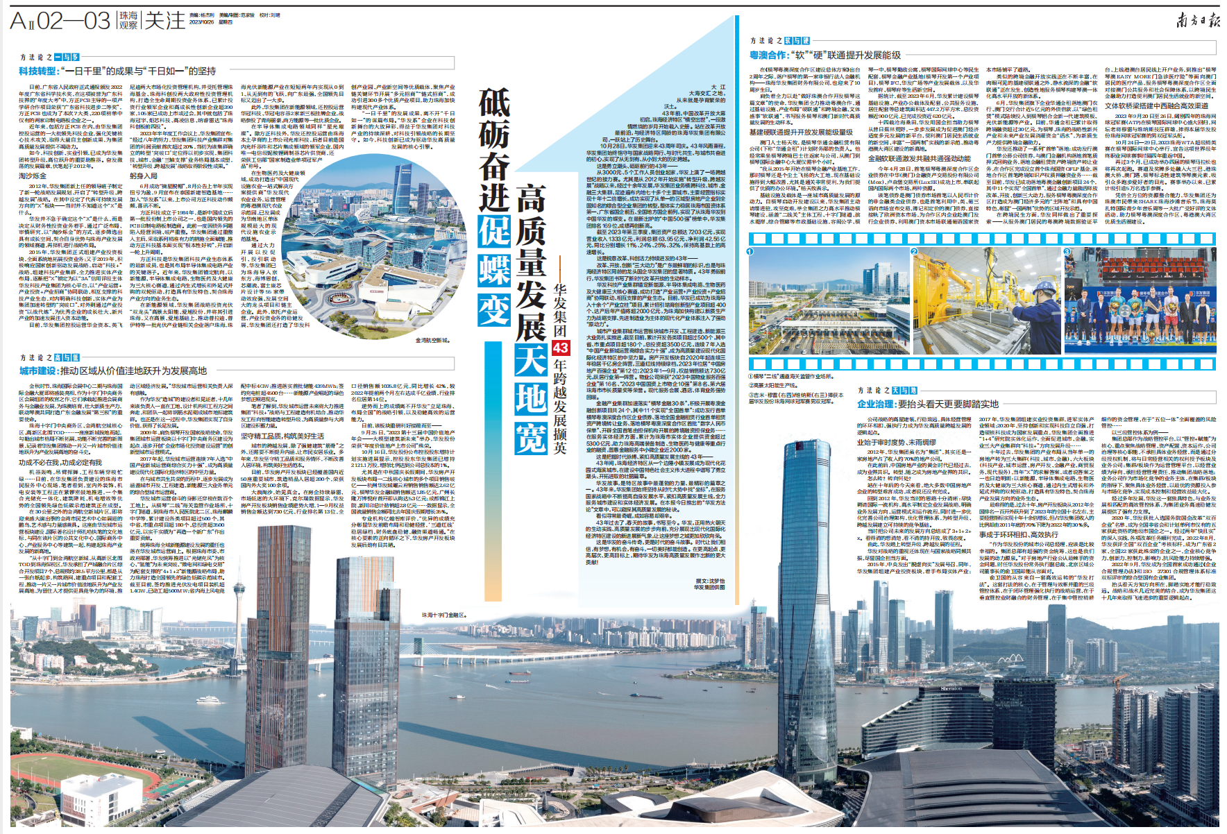 华发故事,是特区故事中最蓬勃的力量、最精彩的篇章之一。43年来,华发集团始终坚持从时代大势中找“坐标”,在服务国家战略中不断提高自身发展水平,紧扣高质量发展主线,全力服务城市建设和实体经济发展。在本报今日推出的“华发方法论”文章中,可以窥探其高质量发展的秘诀。