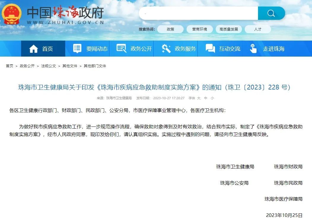 近日,珠海市卫生健康局、珠海市财政局、珠海市公安局、珠海市民政局和珠海市医疗保障局联合印发《珠海市疾病应急救助制度实施方案》(以下简称《实施方案》)。