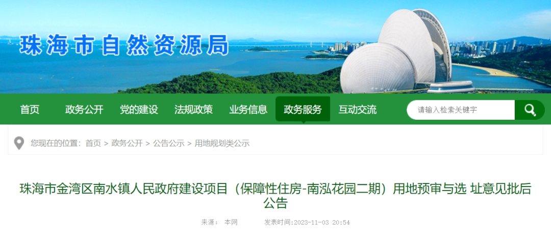 近日,珠海市自然资源局网站发布《珠海市金湾区南水镇人民政府建设项目(保障性住房-南泓花园二期)用地预审与选址意见批后公告》。