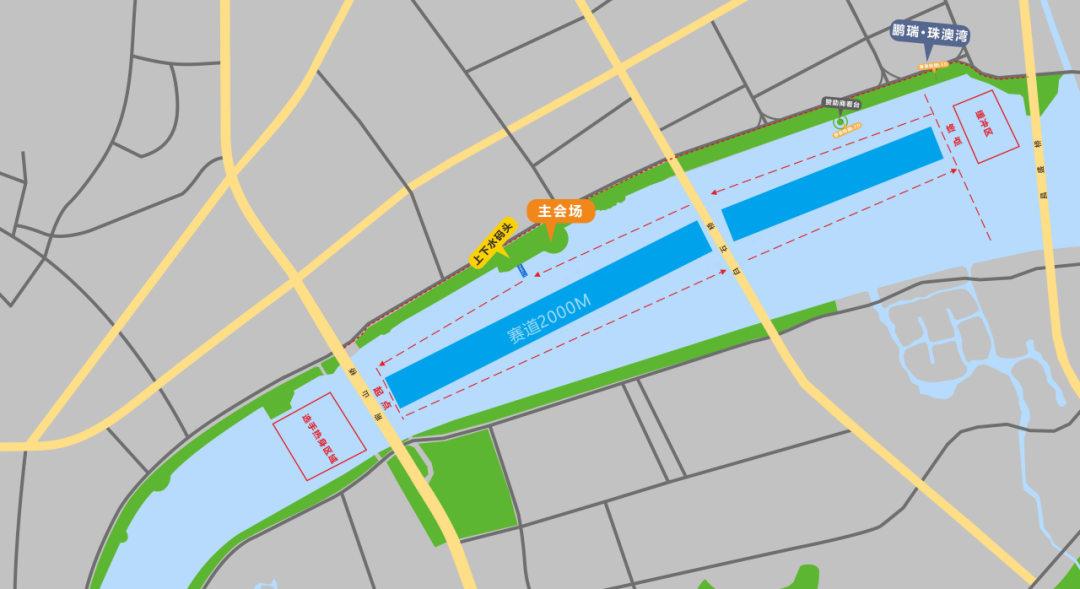 珠海市香洲区前山河水域,起点为前山桥附近,终点至昌盛桥附近,全长2千米。沿岸共设一个主会场,两个看台供大家观看比赛。