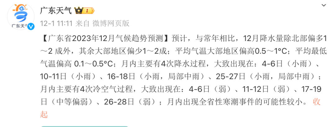 根据“广东天气”微博近日发布的消息,本月内主要有4次冷空气过程,大致出现在:4-6日(弱)、11-12日(弱)、17-19日(中等偏弱)、26-28日(弱);月内出现全省性寒潮事件的可能性较小。