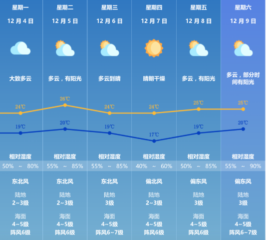 根据珠海市气象台预计,未来几天珠海多云为主,气温有所回升;展望本周中后期新一股冷空气影响珠海,北风加大,气温小幅下降。另外,近期干燥少雨,全市森林火险橙色预警仍在生效,街坊们注意森林防火和居家用电用火安全!