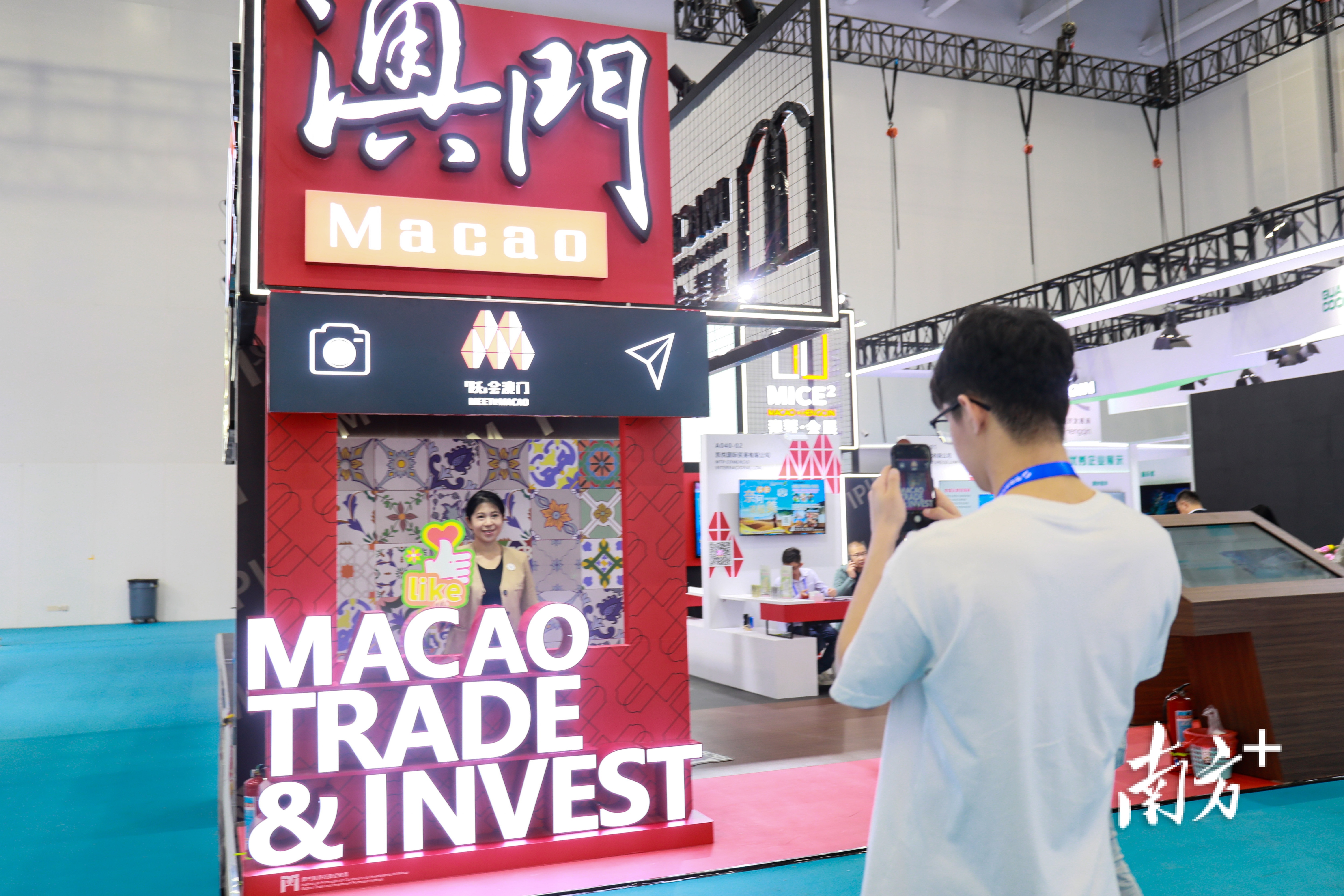 展馆内香气扑鼻,工作人员身着葡萄牙传统服装,和参展观众分享着巴西咖啡。与“横琴展区”临近,澳门贸易投资促进局也现场设置了“澳琴·会展”展区,宣传琴澳营商环境及政策优势,共组织7家澳门企业和服务机构展示澳门服务贸易行业现况。
