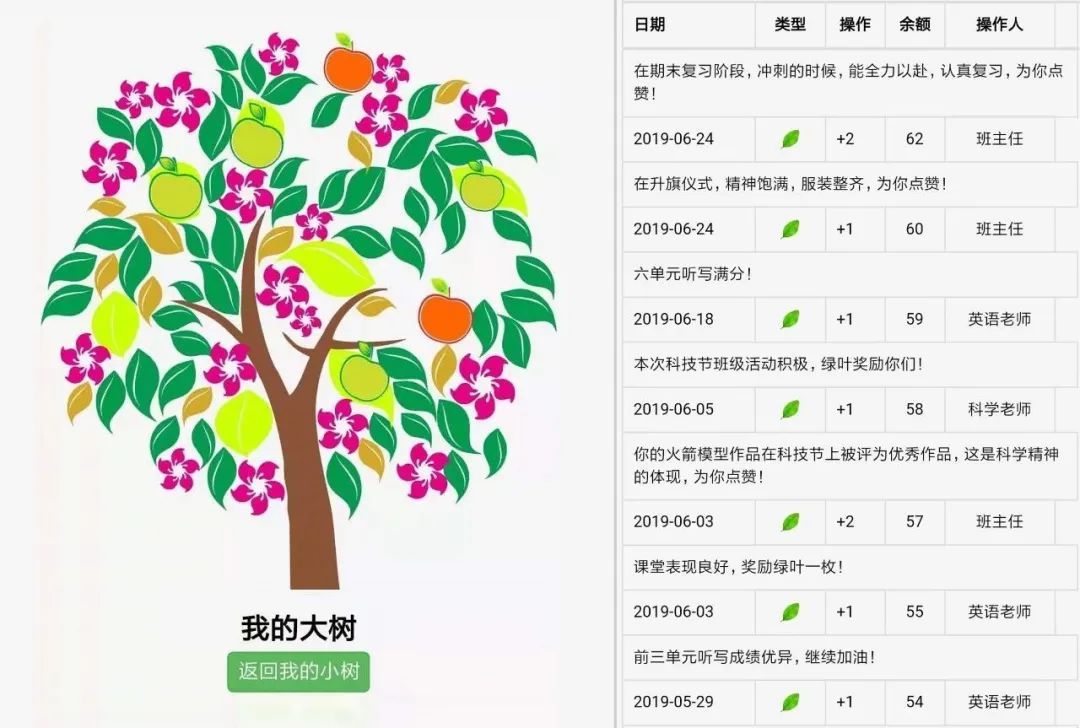 “‘我的成长树’记录内容很多元,不仅关注学生学业成绩、健康品格,还关注创新精神和实践能力,充分尊重个体差异,注重学生成长发展的过程。”该校副校长阳朝阳说,学生但凡在学校通过努力有了进步就能得到老师及时肯定并以绿叶记录下来,促使小树生长,直至开花、结果,凸显对学生的正向激励。如果学生出现了偏差行为,成长树就会长出黄叶,提醒学生尽快纠正,而当学生出现强偏激行为,成长树还会出现“毛毛虫”,此时老师将和家长联合“会诊”,共同帮助孩子及时解决问题。