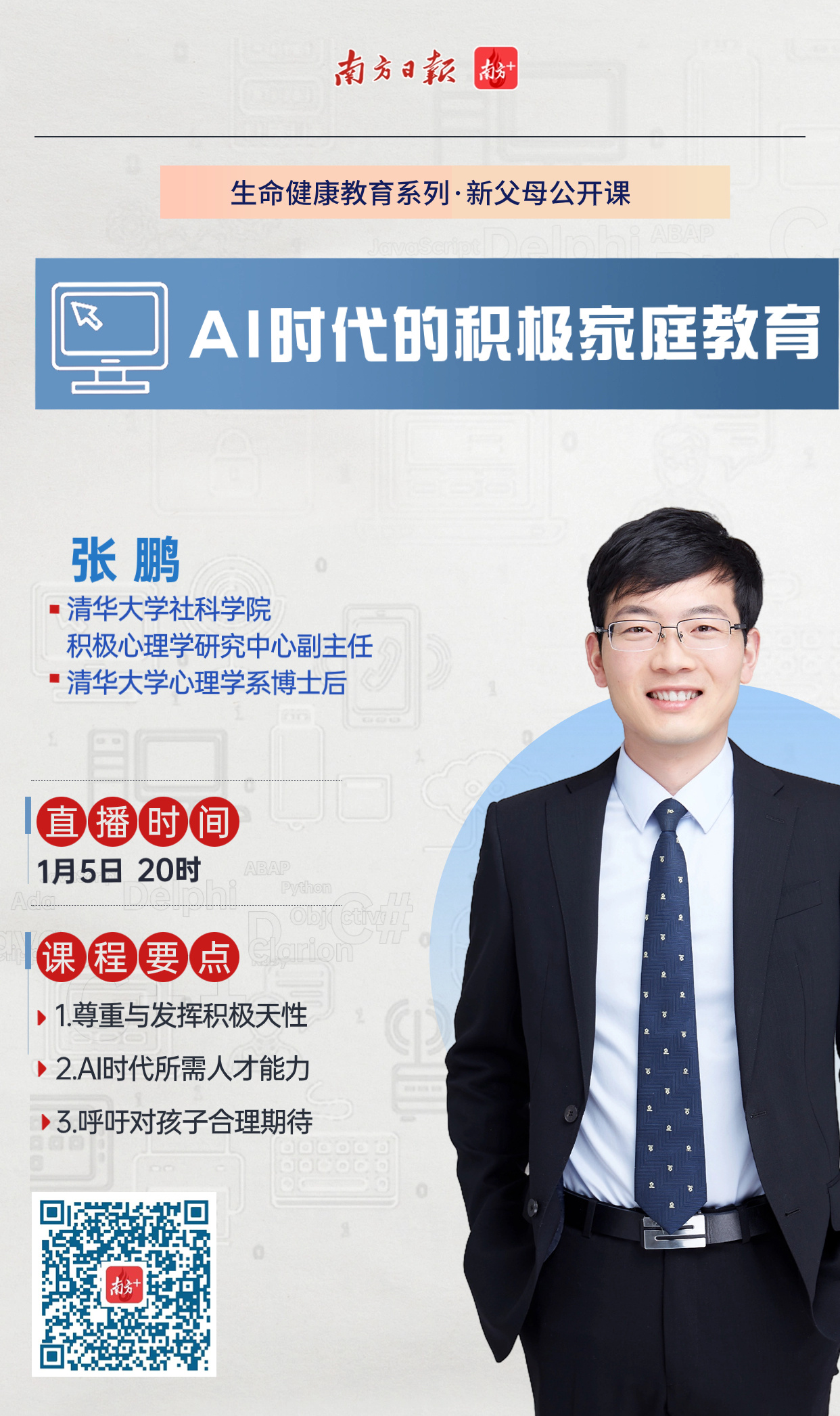 什么是积极心理学?如何在家庭教育中运用积极心理学?怎样培养AI时代不可或缺的能力?第六期“生命健康教育系列·新父母公开课”邀请张鹏授课。