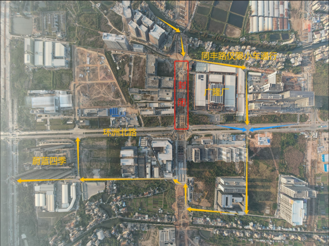 2. 环洲北路(隧道东侧)两侧厂企车辆可按照图中的蓝色指示线路绕行至蔚蓝四季;