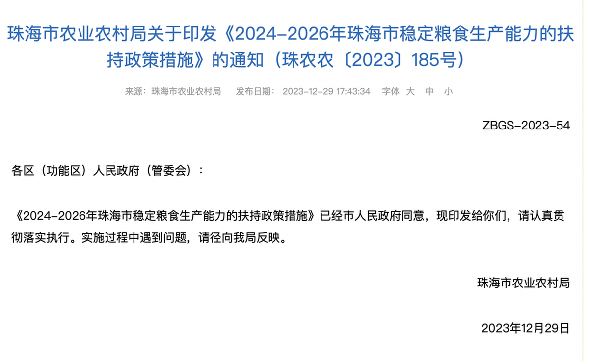 近日,记者从市农业农村局获悉,为毫不放松抓好粮食生产、坚决筑牢粮食安全防线,经珠海市人民政府同意,市农业农村局印发《2024—2026年珠海市稳定粮食生产能力的扶持政策措施》(以下简称《政策措施》),以进一步提高农民种粮和基层抓粮积极性,稳定粮食生产能力,完成省下达粮食大豆生产目标。