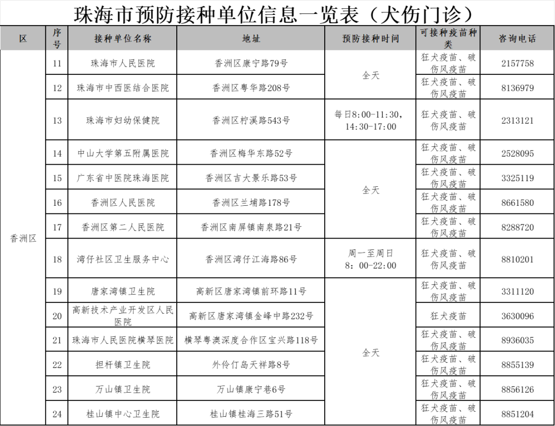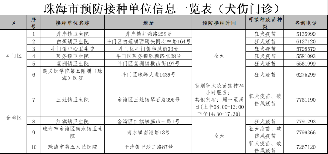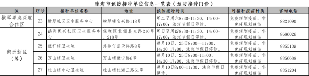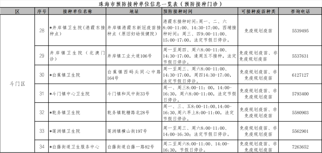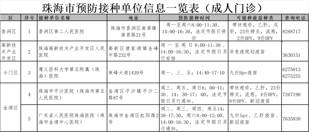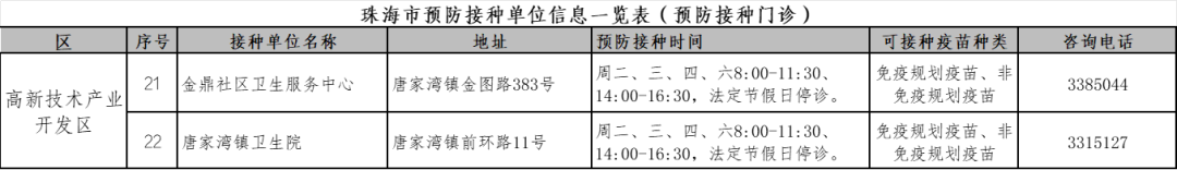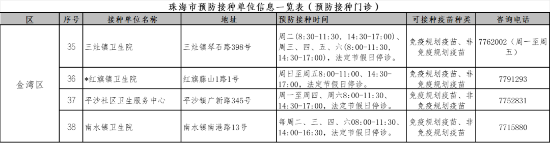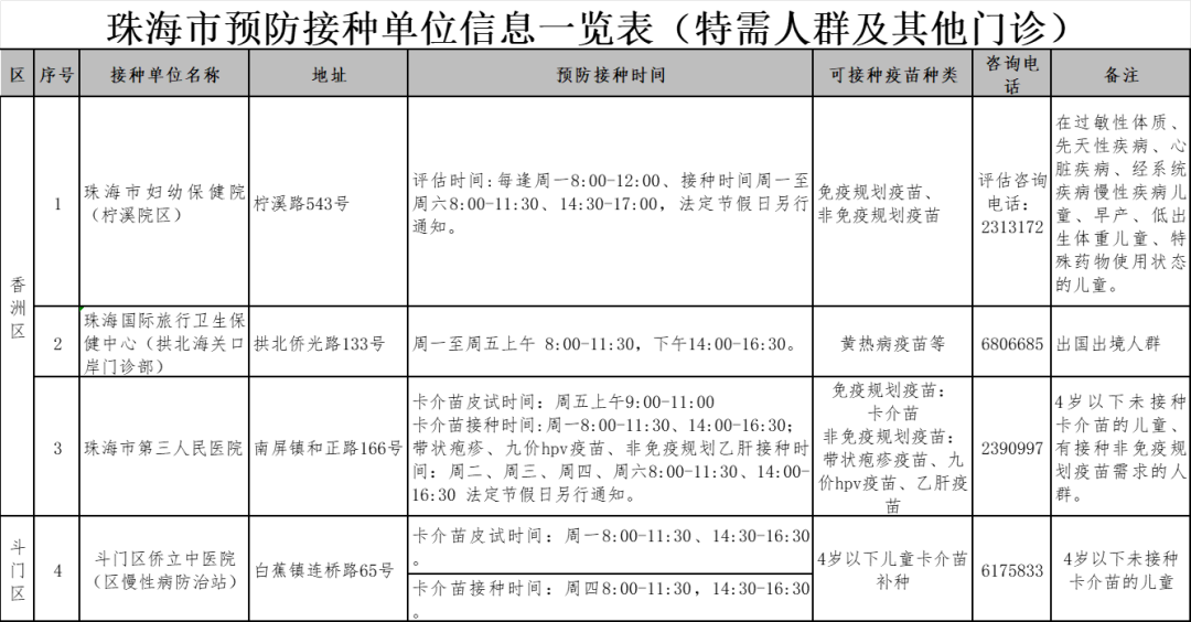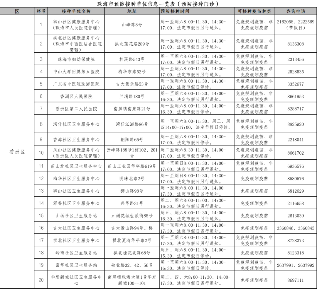珠海各预防接种点的信息,