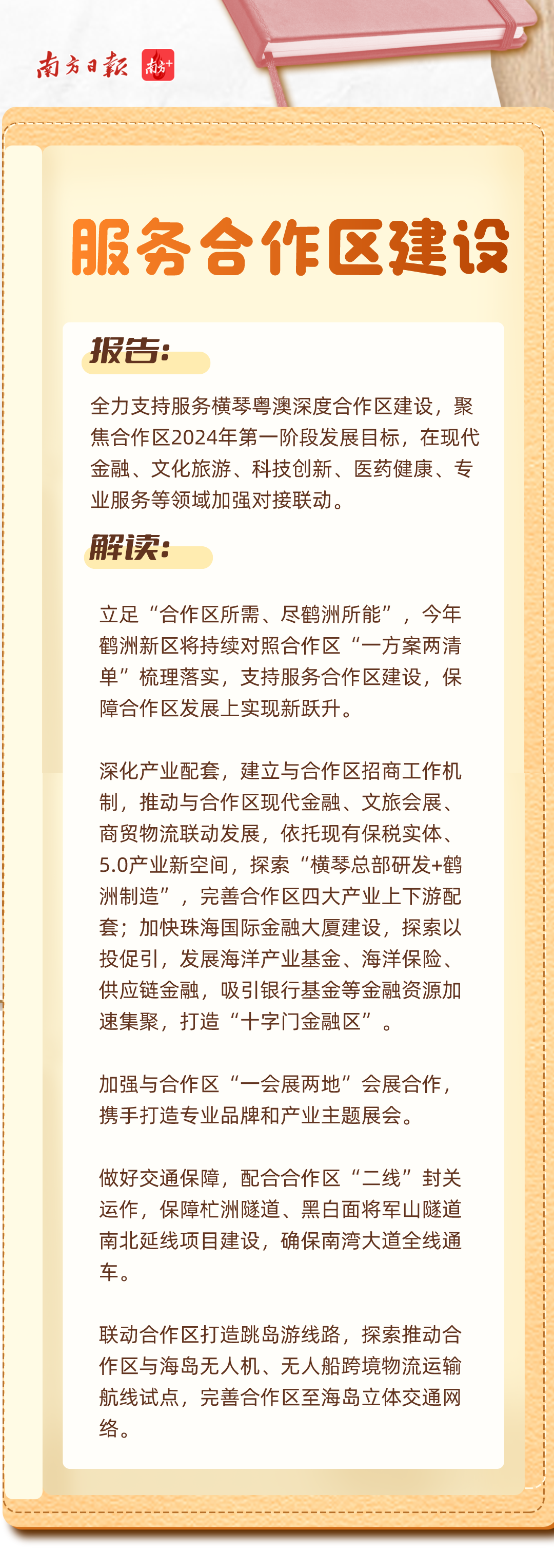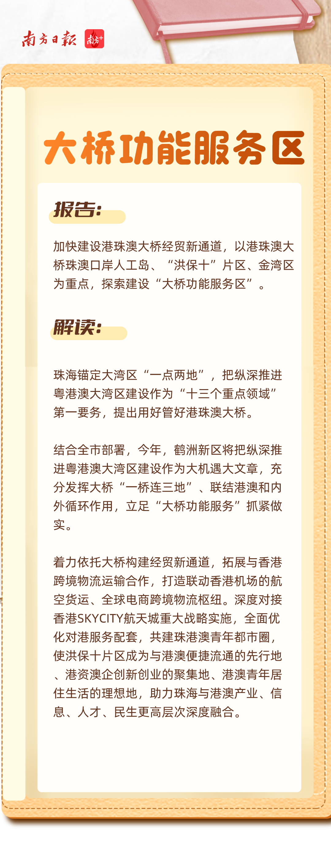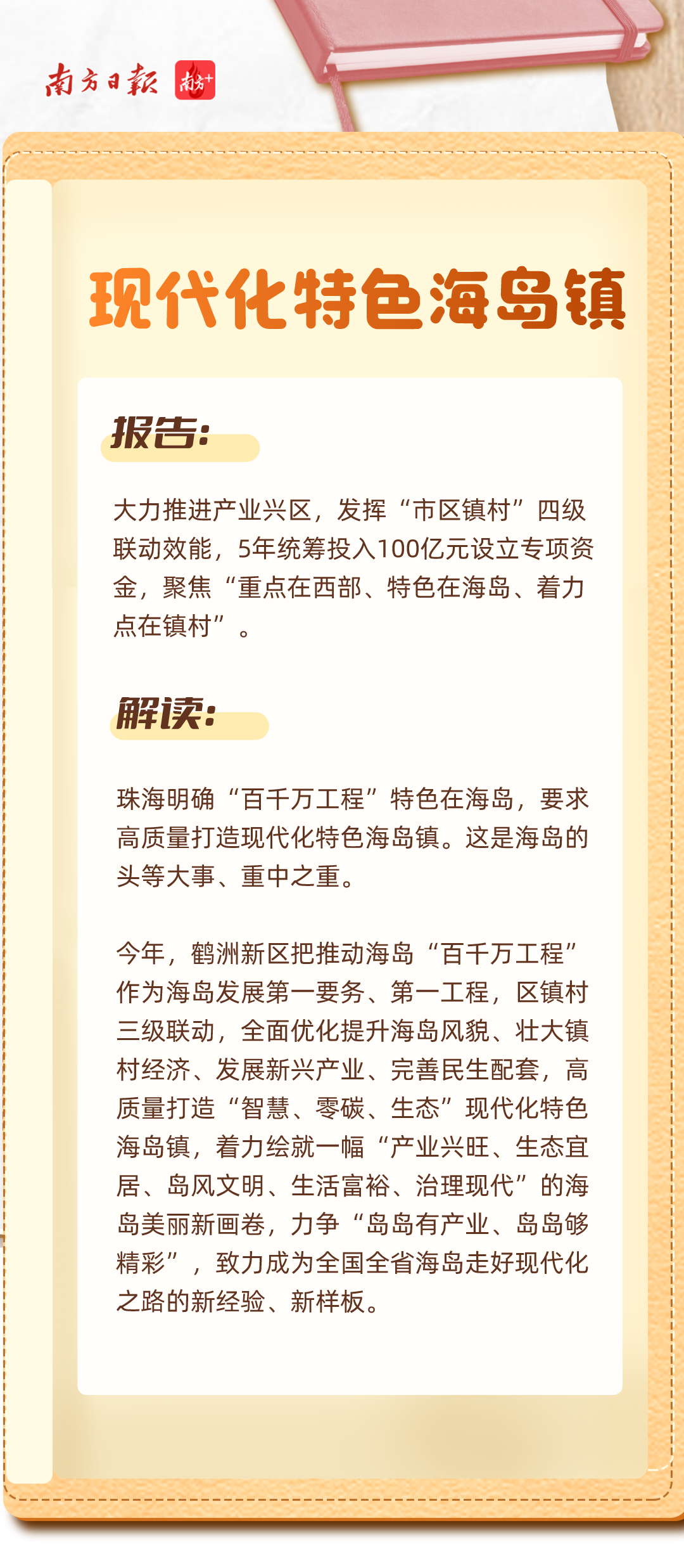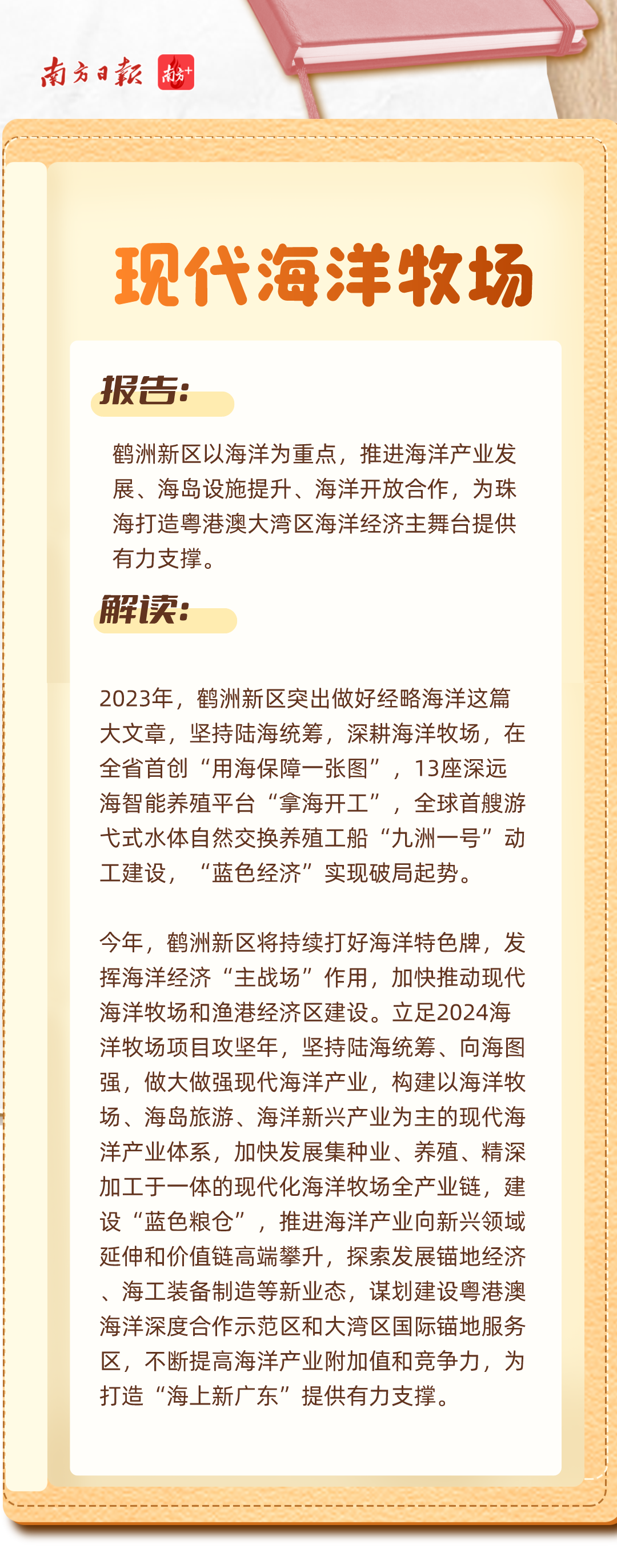 报告中,鹤洲新区被多次提及。其中,既有对“百千万工程”海岛新样板和海洋经济发展的期待,也有对服务港珠澳大桥经贸新通道及横琴粤澳深度合作区建设的新要求。
