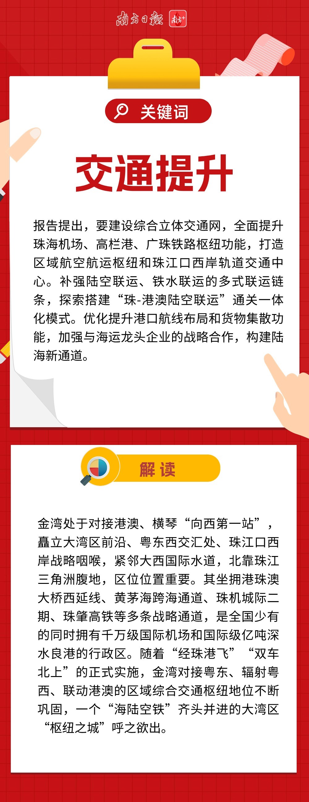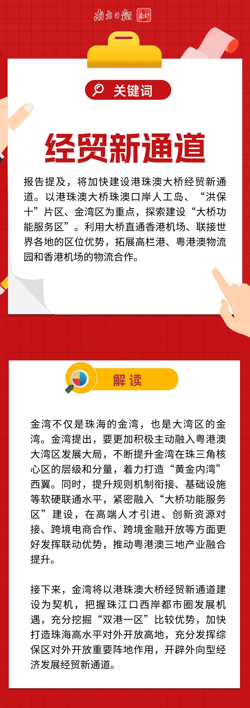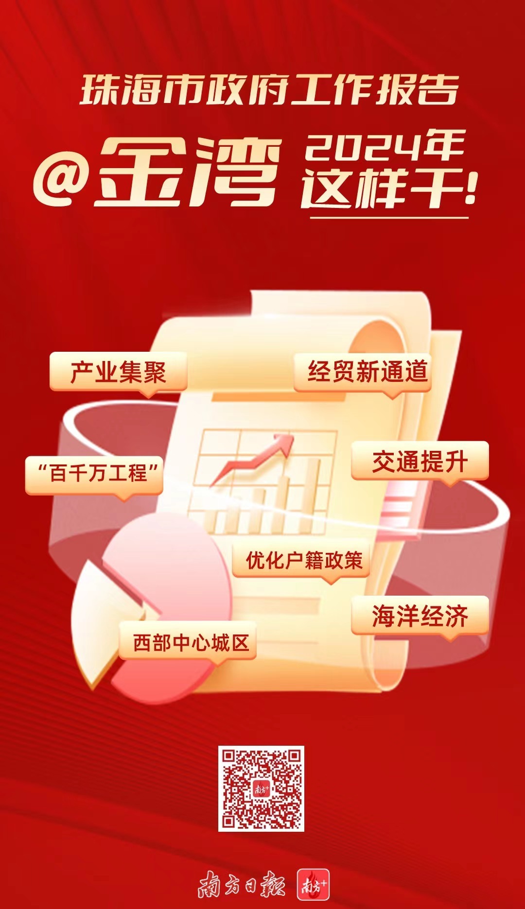 近两万字的报告,描绘珠海新一年发展的巨幅蓝图,金湾区也被赋予了更多期待。不仅在优化产业空间、试点户籍政策等方面被直接提及,还涉及多处与金湾区息息相关的工作部署。
