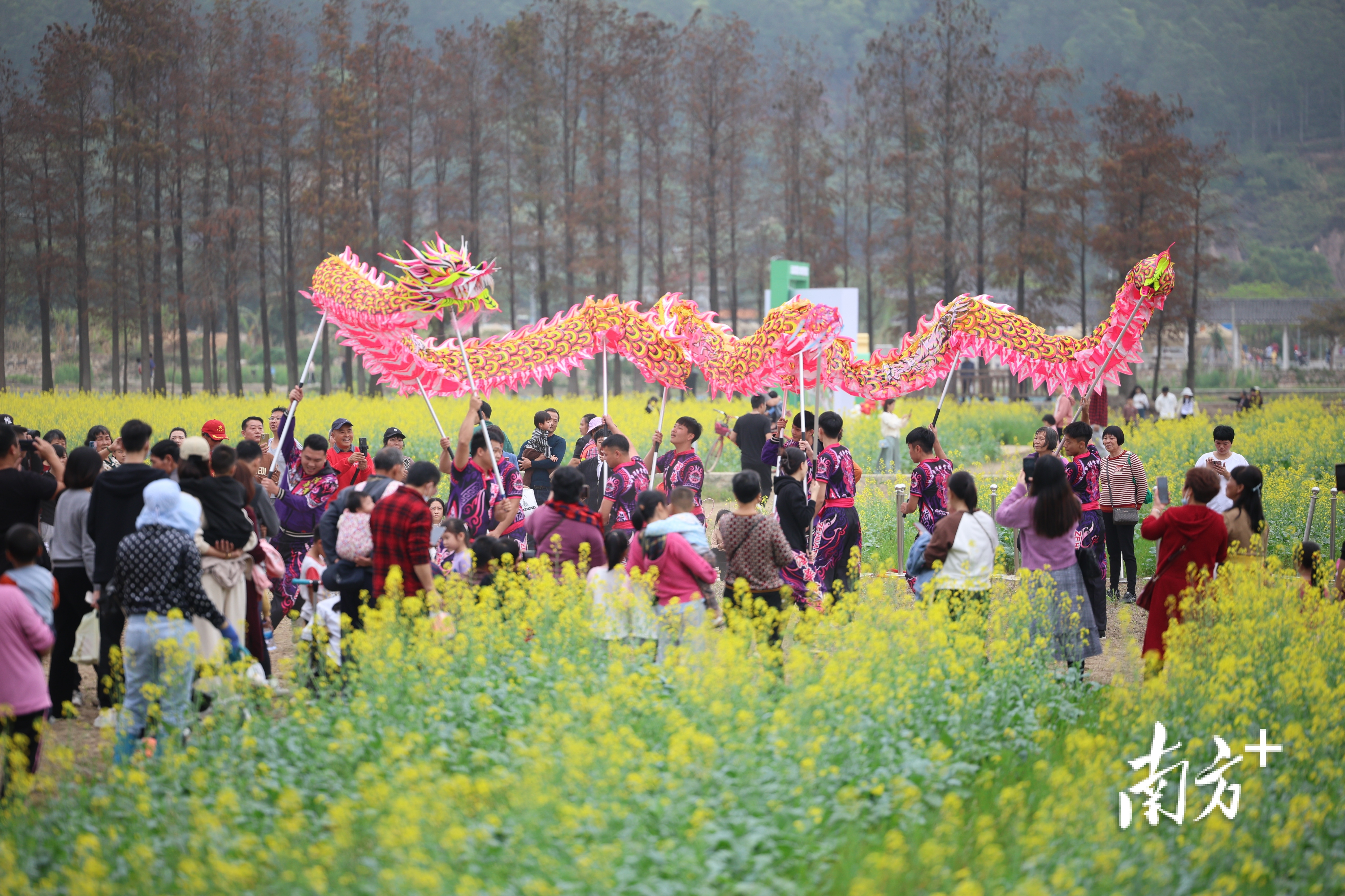 立春时节,新村已经是一片花的海洋。千亩花海竞相开放,油菜花、格桑花、太阳花和特色果蔬错落有致,在连片稻田中随风摇曳,与远处的落羽杉构成一幅乡愁岭南画卷。