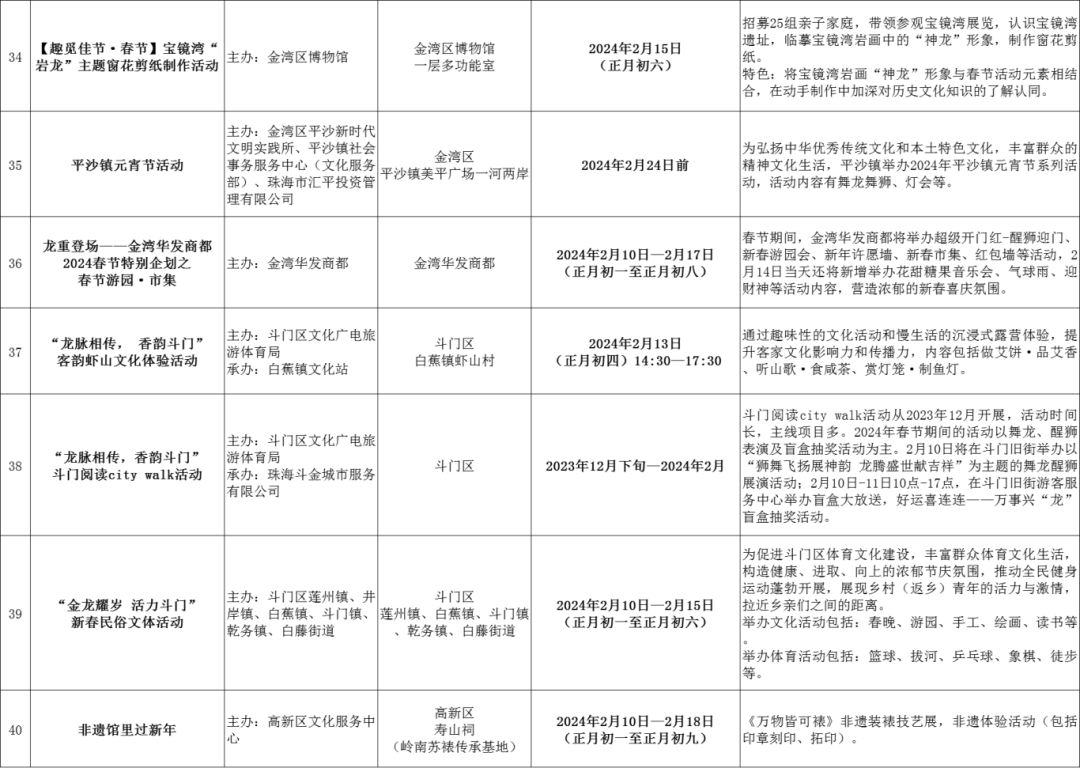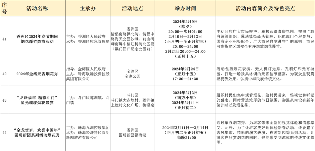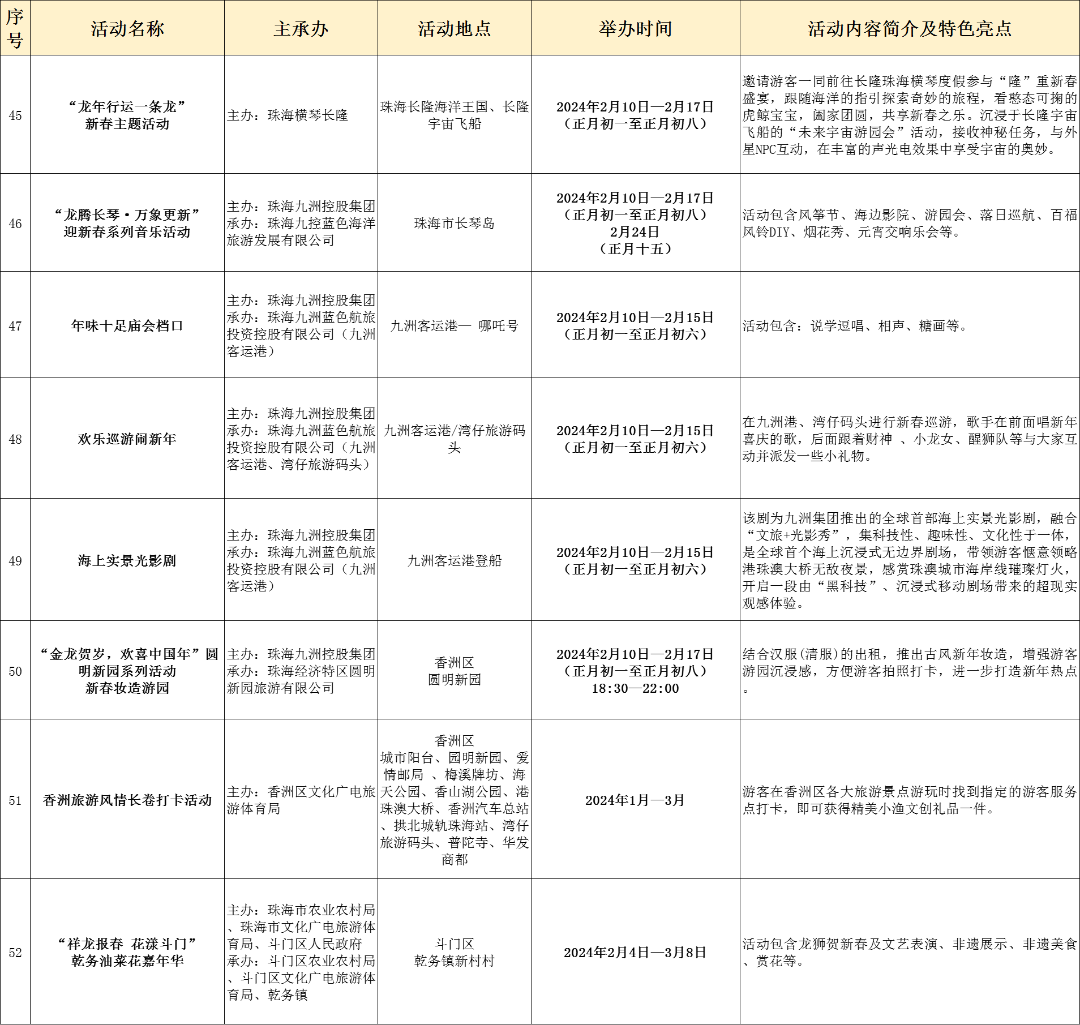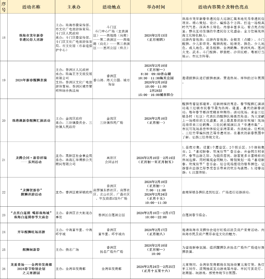 2月13日(正月初四),珠海市龙年新春非遗民俗大巡游将在斗门西堤路黄杨河湿地公园段举行。16个表演方阵、超千名演员将献上一场“龙味”十足的艺术盛宴。