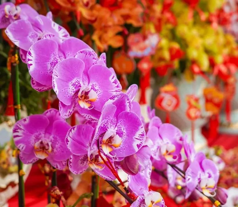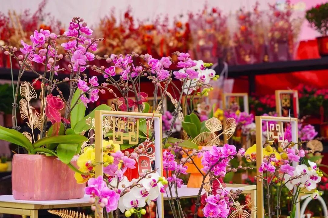 迎春花市的主角,莫过于鲜花了,缤纷多彩的蝴蝶兰、大“桔”大利的年橘、热情的红掌、绚丽的杜鹃……几十种各色花卉竞相绽放,一派繁花闹春的热闹场面。