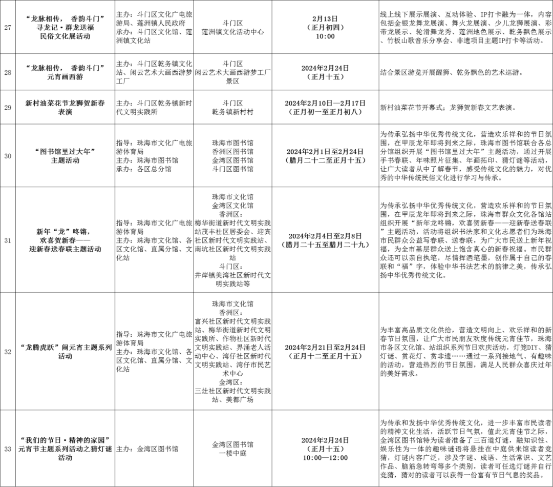 2月24日,“瑞龙歌盛世 金鼓闹元宵”文艺晚会将在海天公园举办。现场展演舞蹈、歌曲、器乐、粤曲、猜灯谜、舞龙舞狮等人们喜闻乐见的节目。