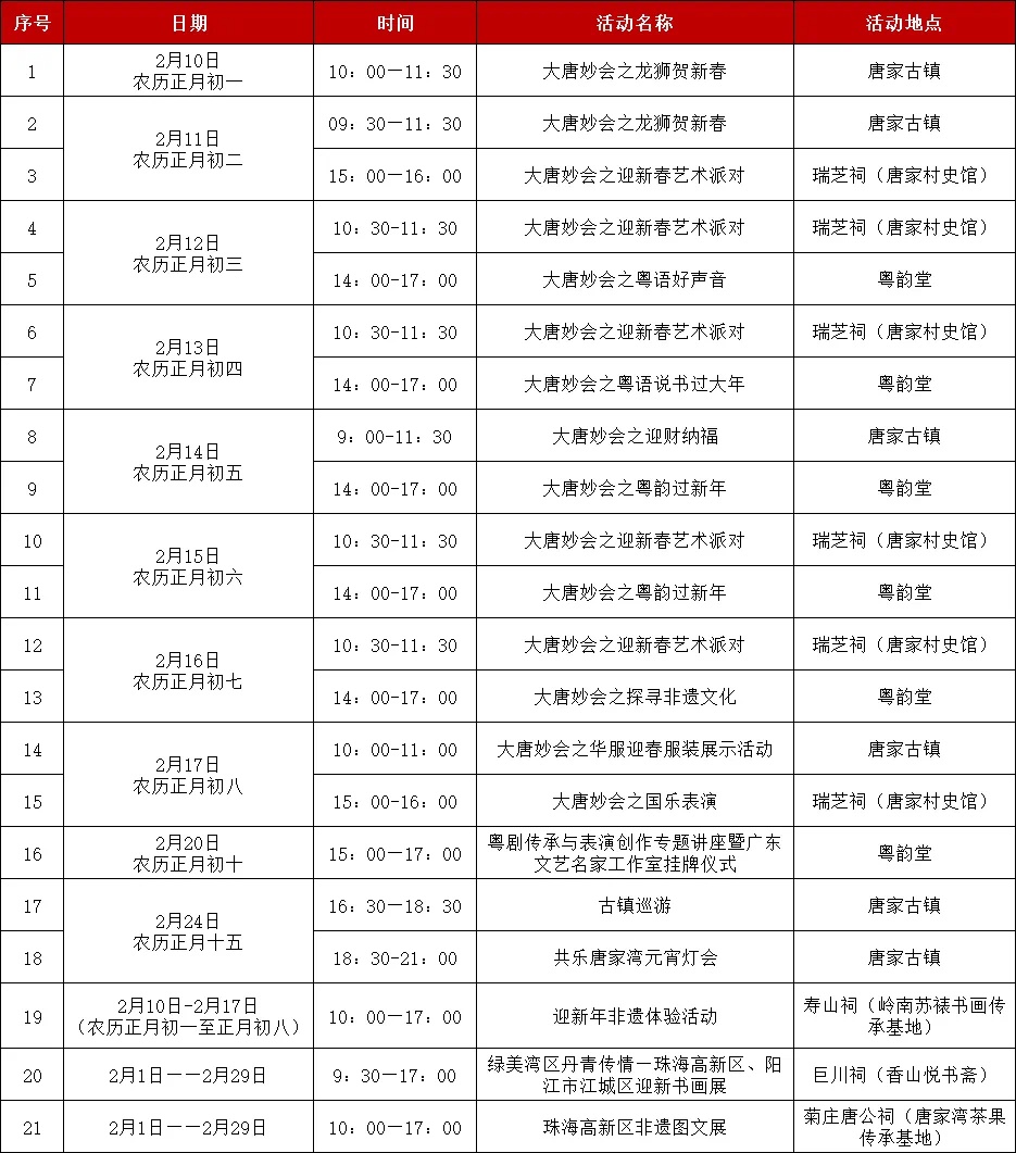 2月10日—2月24日,珠海高新区将在唐家古镇举办“共乐唐家湾之大唐妙会”,包括“龙行大运 古镇迎新”主题表演、“古镇欢乐大巡游”、“共乐唐家湾”元宵灯会三大主题。
