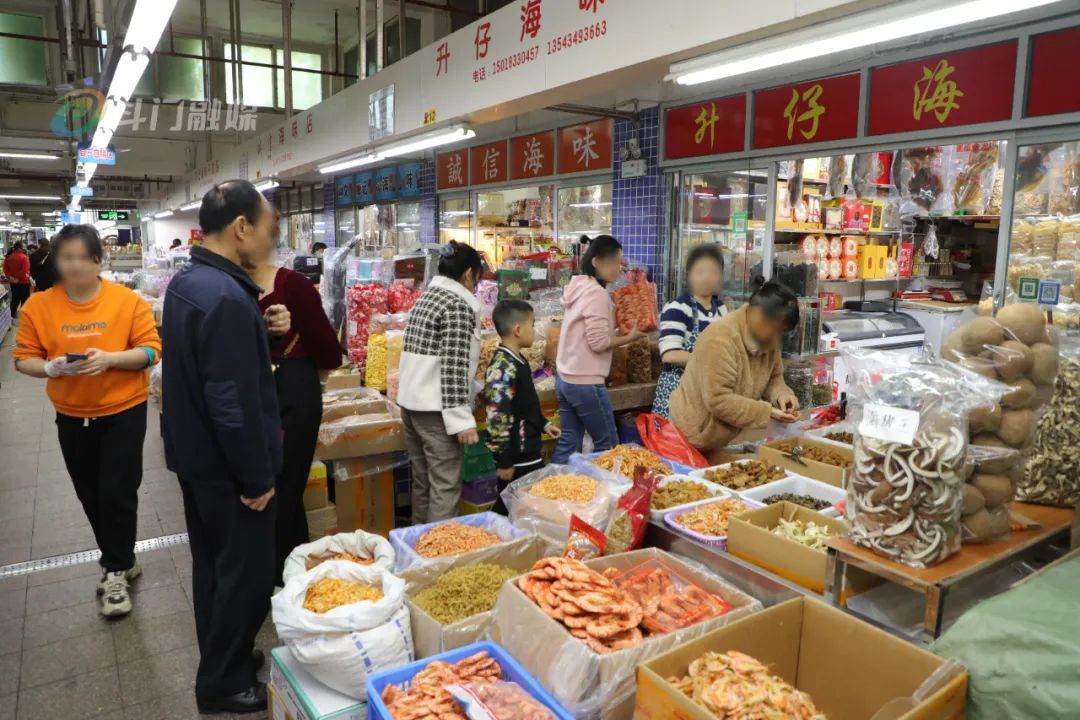 除了生鲜海鲜外,市场二楼售卖的干虾、咸鱼、瑶柱等海鲜干货人气也很火爆。