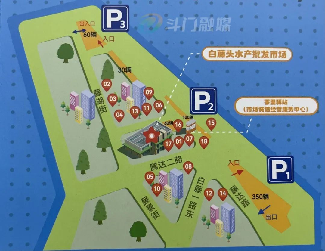 在白藤头水产批发市场东门,设置有游客服务中心,为消费者提供休憩、理赔、称重、咨询等服务。