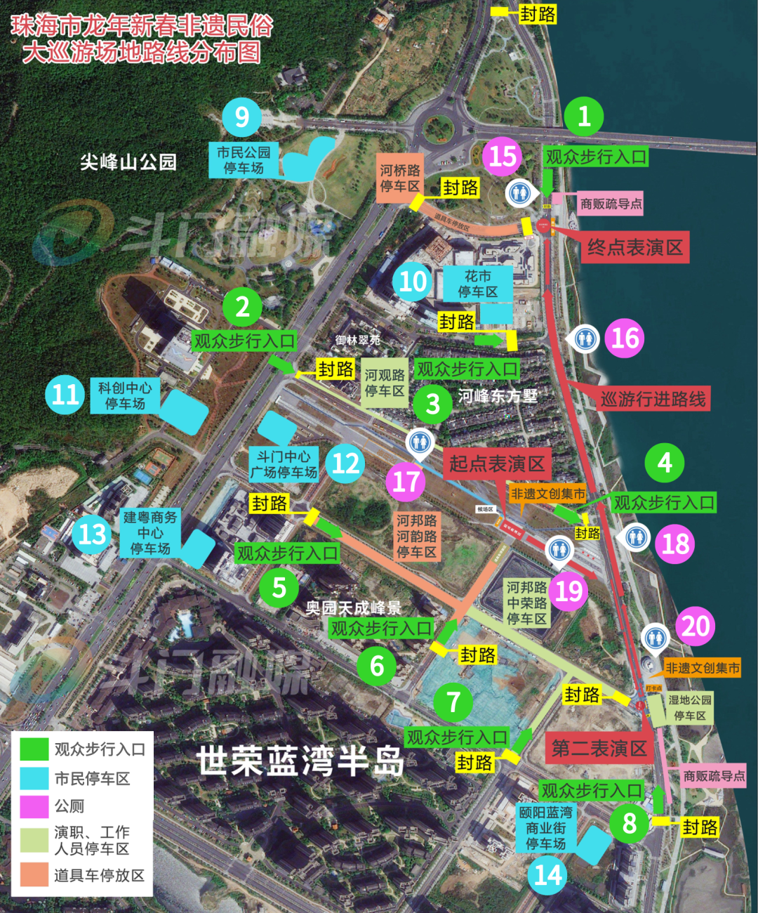 可乘B38、B37、502、303、307、405、525、530路等公交到达“尖峰山公园”或“斗门市民公园”公交车站,再步行至观众入口处。
