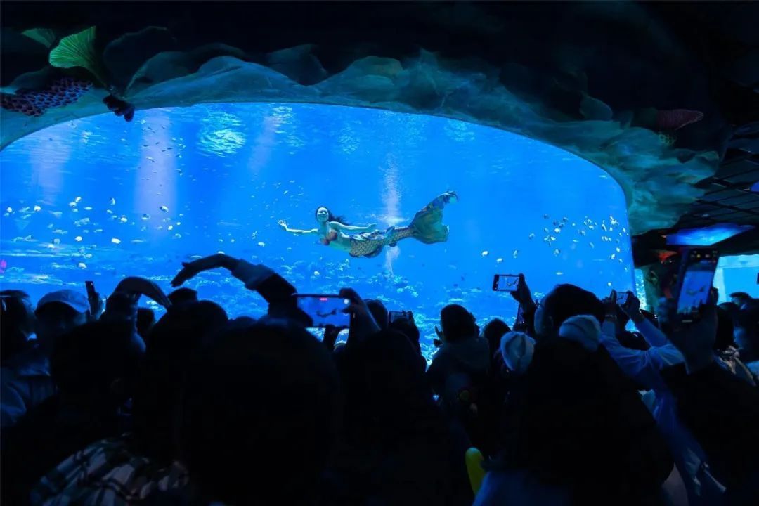 在长隆宇宙飞船的珊瑚秘境,游客们纷纷驻足仰头欣赏,只见“美人鱼”们在缤纷多彩的珊瑚、热带鱼群中舞动着,优雅的舞姿仿佛在讲述深海神秘故事,为海底世界增添了几分奇幻色彩。