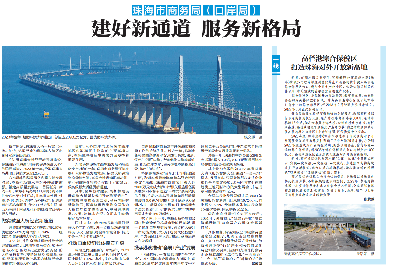 推进港珠澳大桥经贸新通道建设,是珠海协同港澳“用好管好港珠澳大桥”的重要举措。2023年全年,经港珠澳大桥进出口总值达2093.25亿元。