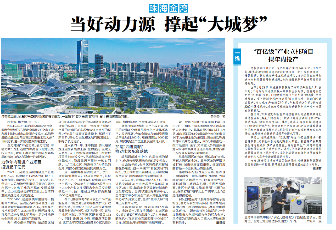 2024年年初,珠海市金湾区党代会、区两会相继召开,锚定金湾作为“全市工业发展主阵地、城市功能提升支撑点、珠海经济能级量级迈向更高层次的重要动力源”目标要求,进一步谋划蓝图部署工作。