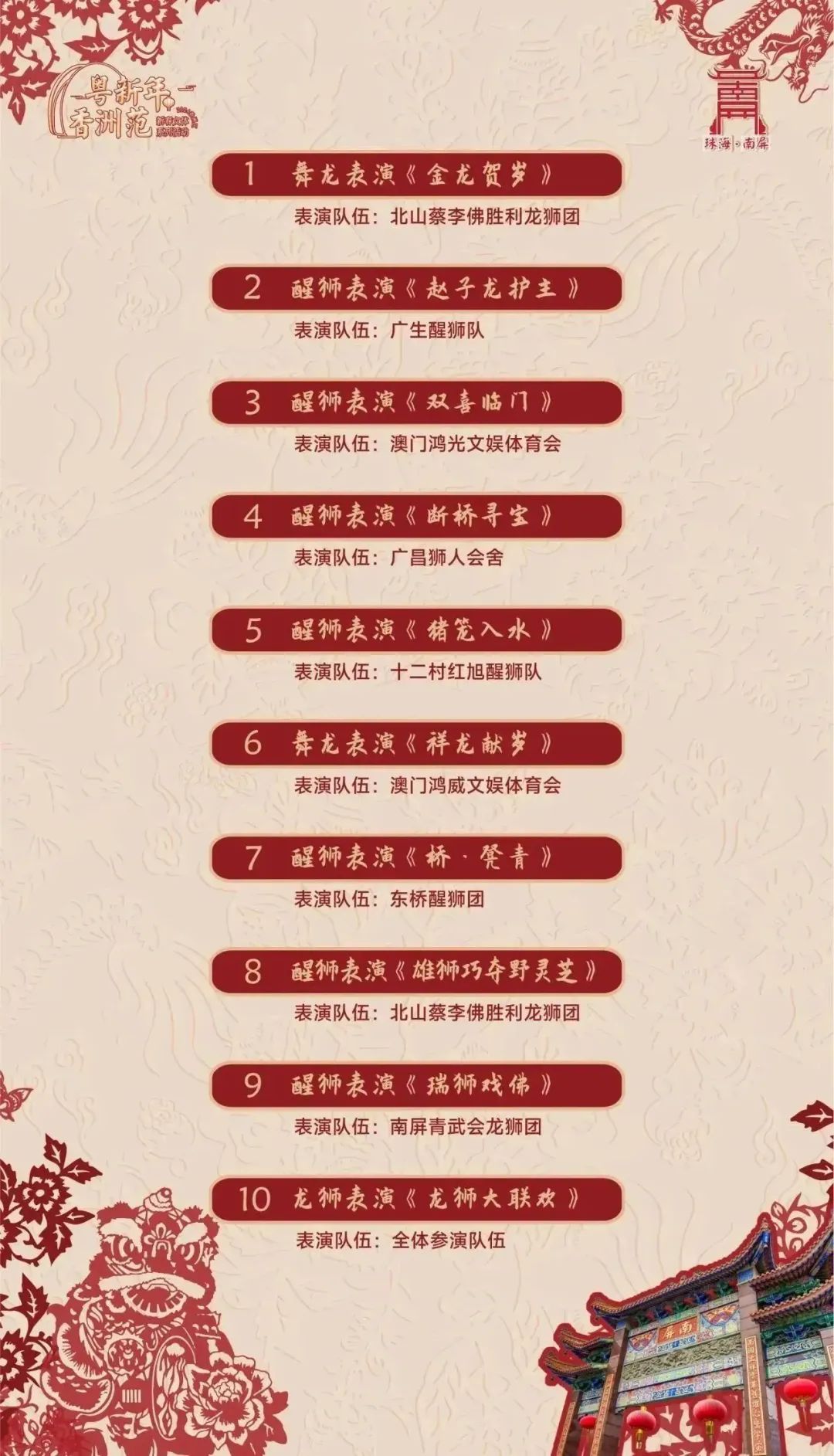 活动介绍:岭南龙狮、粤剧行当表演等将在海天公园内热闹巡游。随后,岭南龙师伴粤歌表演《瑞龙耀湾区》、粤剧《思凡》、杂技《奔月》、蒙古族《顶碗舞》、京剧《贵妃醉酒》选段、潮剧《苏六娘之春风践约到园林》、华南八极拳表演《男儿当自强》、琵琶弹唱《海缘》等十余个精品节目将逐一亮相。