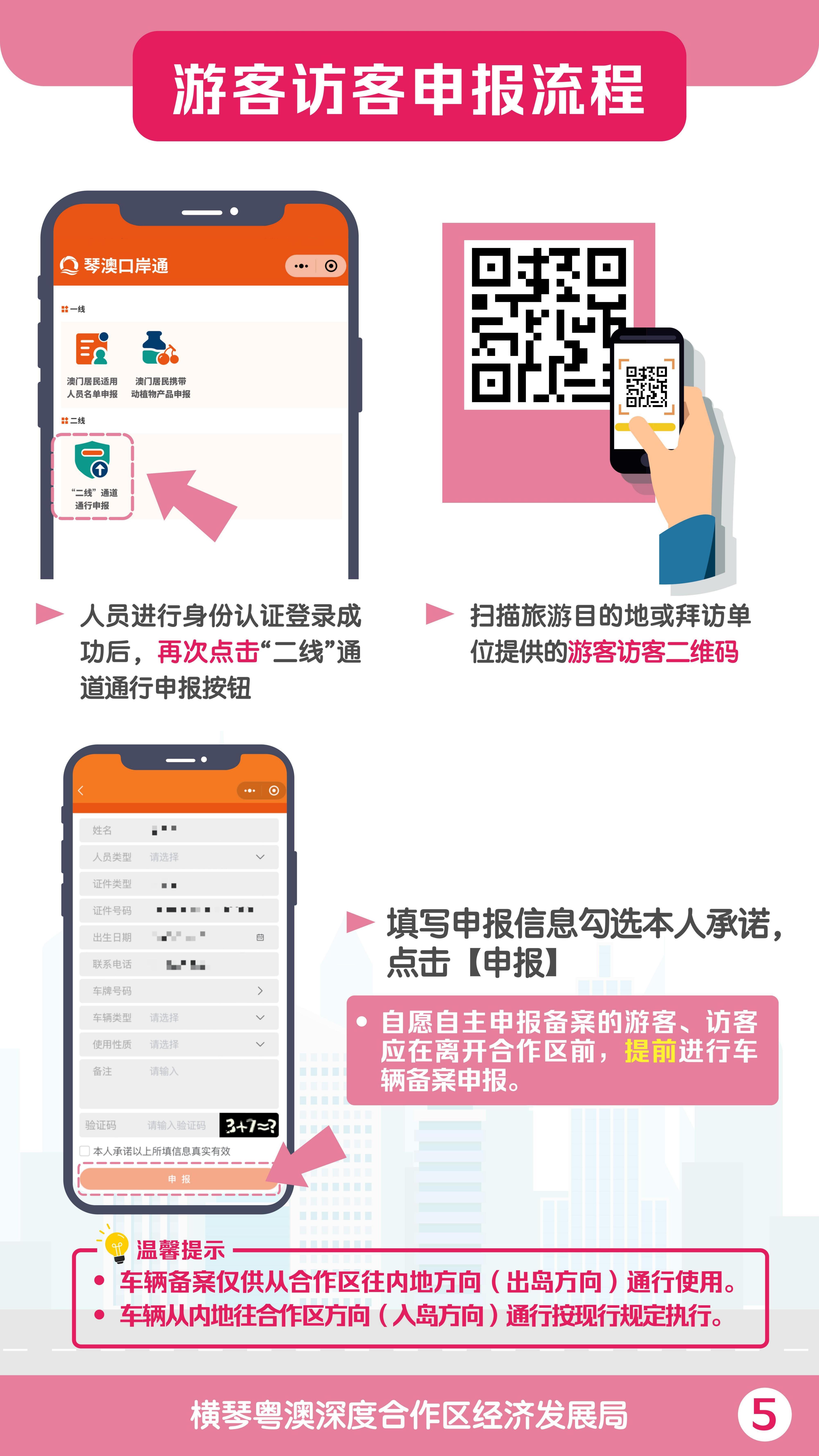 所有驾驶车辆到合作区的游客、访客,可扫描横琴粤澳深度合作区(下称“合作区”)游客访客二维码申报备案,便利出区。