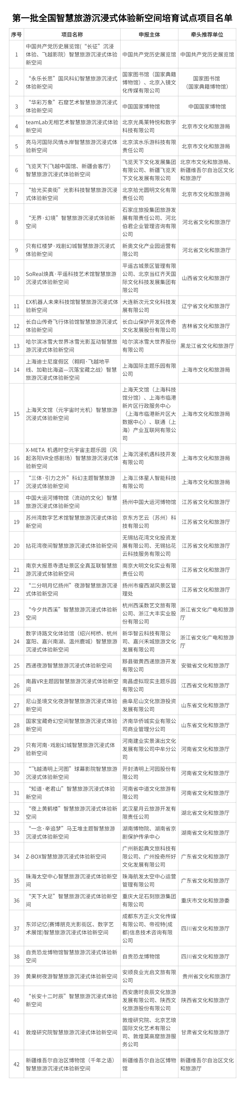 近日,文化和旅游部、国家发展改革委、工业和信息化部发出通知,公布第一批全国智慧旅游沉浸式体验新空间培育试点项目名单,敦煌研究院智慧旅游沉浸式体验新空间等42个项目入选。其中珠海太空中心成功入选首批名单,是广东省入选的两个项目之一。