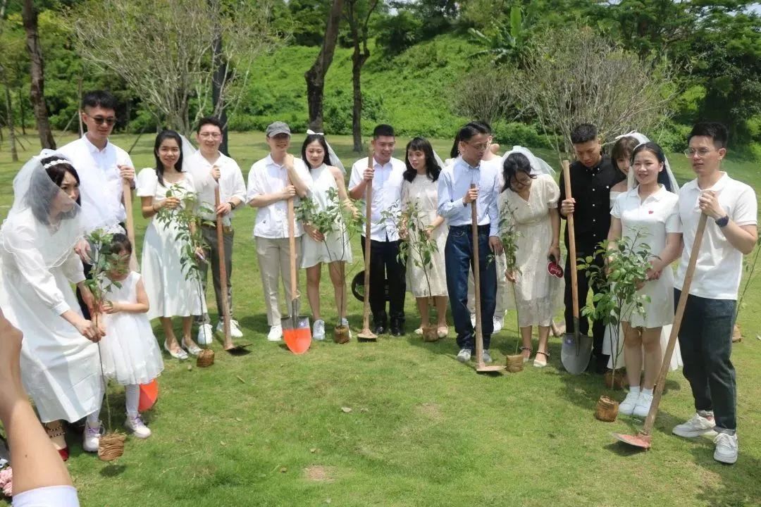 市民政局副局长朱朝卫、香洲区政府副区长苗奇峰、香洲区民政局、市自然资源局香洲分局、市慈善总会、民盟珠海光明支部、珠海正方公共资源运营有限公司相关负责同志,以及新人等约50人到场参加了本次植树活动。