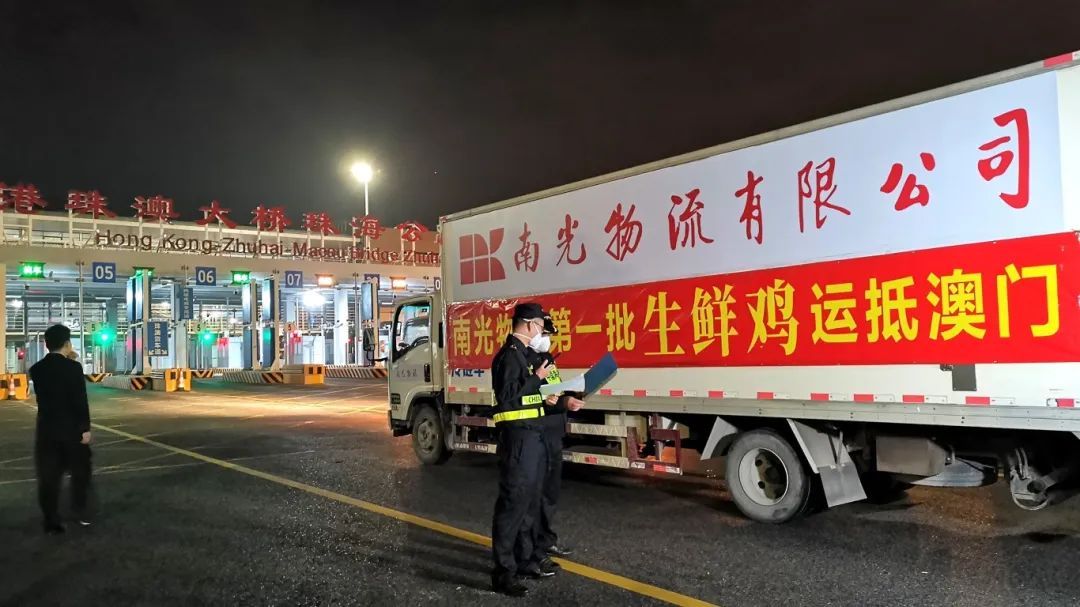 随后,拱北海关所属斗门海关关员一边监装,一边核对证书。监管作业完成后,该批生鲜鸡肉装车前往港珠澳大桥,经鲜活食品“绿色通道”通关,1个小时后,就出现在澳门市场销售。