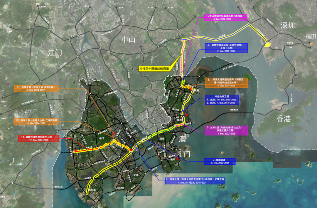 《草案》明确,对接深中通道战略通道沿线的重点路段和节点的建设工作将纳入近期实施计划。其中,金琴快线北延线工程、兴业快线工程、九洲大道、珠海隧道、珠海大道扩建工程、中山东外环二期工程正在建设,预计2024—2025年之间建成;珠峰大道正在开展工程前期,计划2025年建成;港湾大道、机场东路、富蕉大道均处于规划阶段,计划2026—2027年建成。