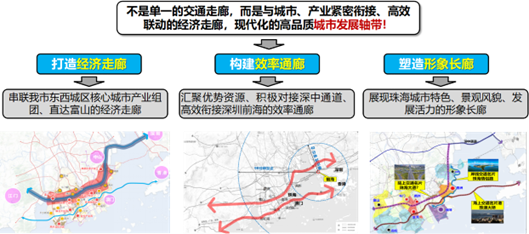 《草案》明确提出,对接深中通道的战略通道不是单一的交通走廊,而是串联珠海市东西城区核心城市产业组团、直达富山的经济走廊;汇聚优势资源、积极对接深中通道、高效衔接深圳前海的效率通廊;展现珠海城市特色、景观风貌、发展活力的形象长廊;是紧密衔接珠海市城市、产业组团,高效承接深圳经济、产业外溢的现代化、高品质城市发展轴带。