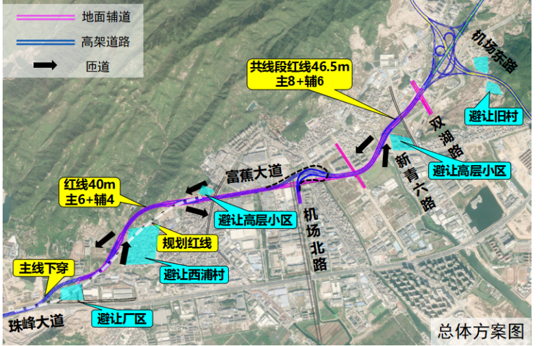 ◆机场东路(珠海大道—富蕉大道)中部分路段可规划为“高架双向六车道+地面双向六车道”的形式。