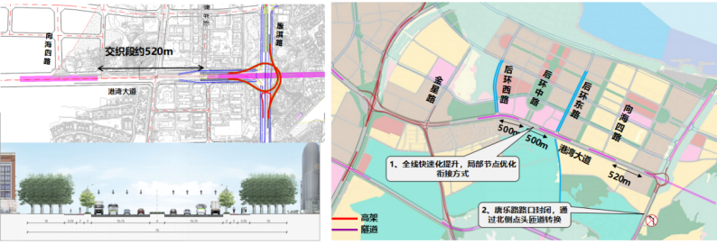 ◆可将港湾大道调整为准快速路,针对后环西路、后环东路、向海四路三个节点设置主线下穿的菱形立交,港湾大道与唐淇路节点设置互通立交。