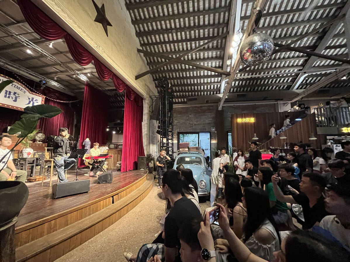 一位中山的游客自驾来到北山,因为避雨偶遇了在旧物仓的歌手表演,“在北山能看到免费的演出很惊喜,音乐质量也很高,之后还会带朋友家人过来玩”。