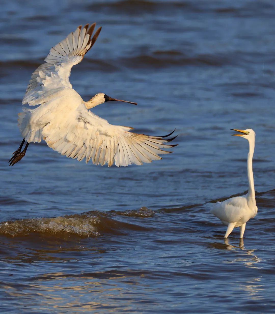 ▲市民谢先生拍摄到的国家一级保护野生鸟类黑脸琵鹭(左)