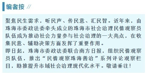 在珠海市委政法委的组织下,多名社会治理民情观察员围绕加强未成年人违法犯罪预防和治理,分享各自见解并给出建议,标本兼治,惩防并举,教育引导未成年人遵纪守法,发挥“1+6+N”基层社会治理工作体系作用,凝聚各方力量,筑牢未成年人保护屏障。