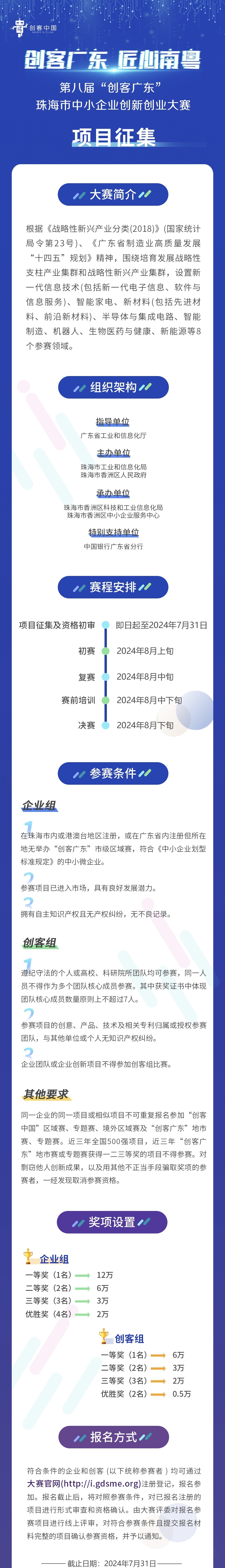 创新项目团队同台PK、专业导师手把手辅导、优先链接创新资源……7月5日,第八届“创客广东”珠海市中小企业创新创业大赛正式开启项目征集,本次大赛以“创客广东 匠心南粤”为主题,旨在为中小企业和创客团队提供展示创新创意、实现产业对接、提升品牌影响力的重要平台。即日起至7月31日,有意参赛的企业和创客均可通过大赛官网注册登记,报名参加。