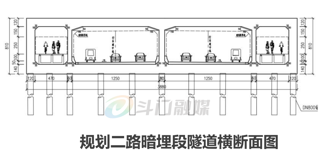 采用城市主干路设计标准,设计车速60公里/小时,双向6车道,双侧布置慢行系统,规划道路红线宽度45米,隧道设雨水泵站一处。